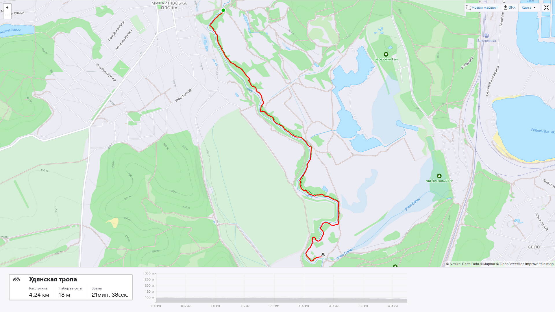 Дошли до речки "Бабаи", дальше тянуть нет смысла, грунтовка проходит по-над самой речкой. Общая длина уже готового маршрута — 4,24 километра. Ровняем от бугорков весь маршрут и обустраиваем оный.