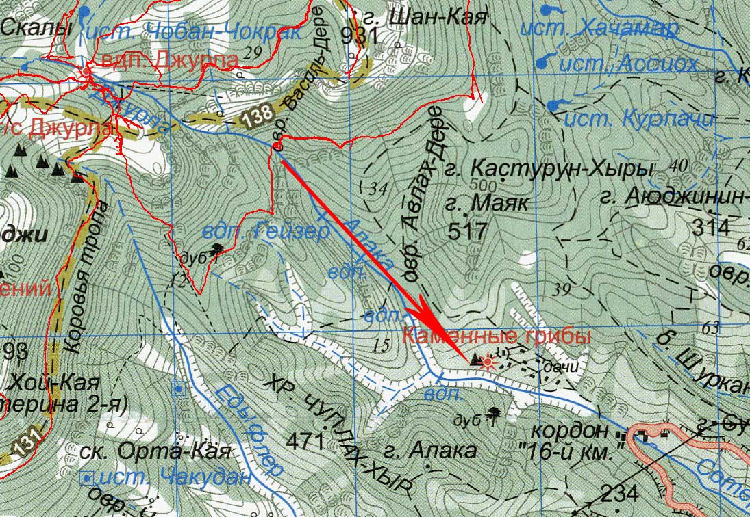 На всем извесной крымской полукилометровке "каменные грибы" обозначены на противоположной стороне оврага (или мини-русла реки), потому многие мимо них частенько промахиваются. На той же карте водопад "Гейзер", который обычно смотрится в паре с грибами обозначен ниже по течению, чем он есть на самом деле.