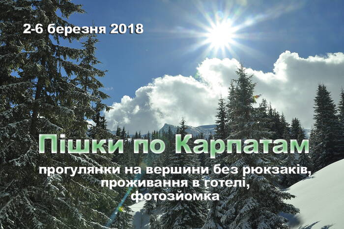 4 березня - трансфер до підніжжя Чорногірського хребта, сходження на г. Говерла, прогулянки лісами, полонинами. Ночівля у готелі.