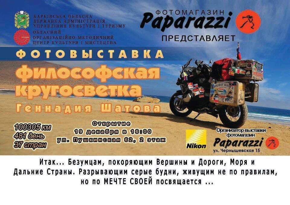 В Харькове 19 декабря состоялось открытие выставки фотографий Геннадия «Философа» Шатова, мотоциклиста из Кишинёва. Несколько лет назад Геннадий продал квартиру, купил BMW R1200GS и отправился в кругосветное путешествие.