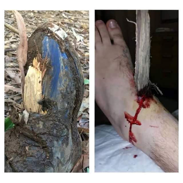 Фотка не моя. В лесу веткой так же проткнуло когда-то мотобот, но обошлось без травм.