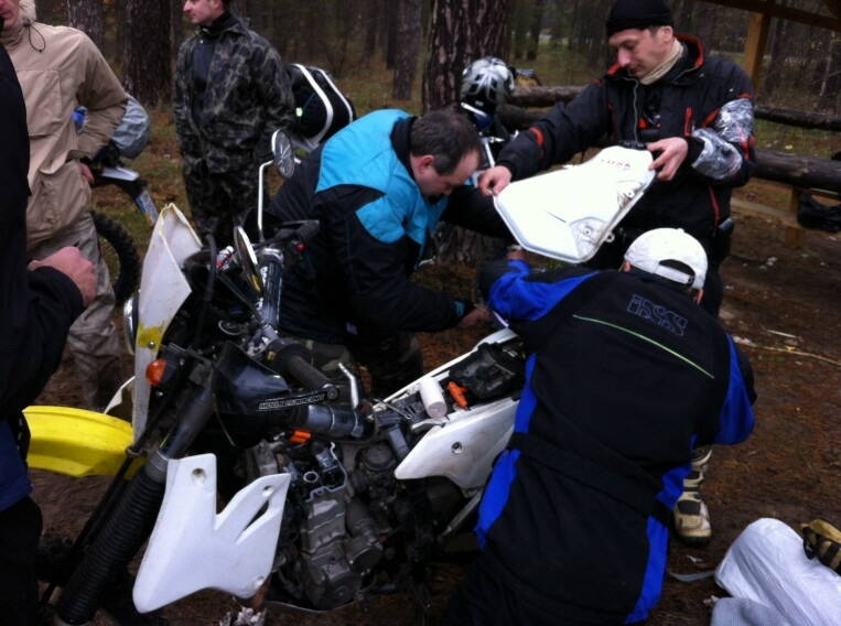 В рейд поехал после безсонной ночи (за 2е суток спал порядка 1.5 часов), думал, в лучшем случае возьму 2-3 точки и поеду в Балаклею к родичам отпаиваться горячим чаем. Однако резвость Сержа и комманды, которые хоть и забывали меня иногда позади, таки придали сил переть дальше стараясь не упускать из виду стоп-огни впередиидущих. Без них я бы наверное ехал бы раза в 2 медленнее и не полез бы в здравом уме и в половину мест, в которые залазили. Вид точно такого же мотоцикла впереди давал уверенности, что уж если он проехал, то и я смогу... 4 падения, заклинивший передний тормоз, остановка поперек 30-40 см глубиной лужи с двухметровой палкой в колесе в спицах (это поэтому вы меня 20 минут ждали после болотистой точки под Балаклеей), уроки езды по песку в стиле "ойептвоюматьящасупаду" и разъяснение от Олексы, как же надо ездить по пескам, не падая, отличные укатанные песочные дороги под Короповым с прыжками, и, в последствии, здоровый 12-часовой полукоматозный сон... Все было, и все было круто. =) Море эмоций, спасибо за такую покатушку. Офигеваю теперь, как я вобще проехал, но ведь проехал! И узнал на что действительно способен мой новый мелкий конык =)