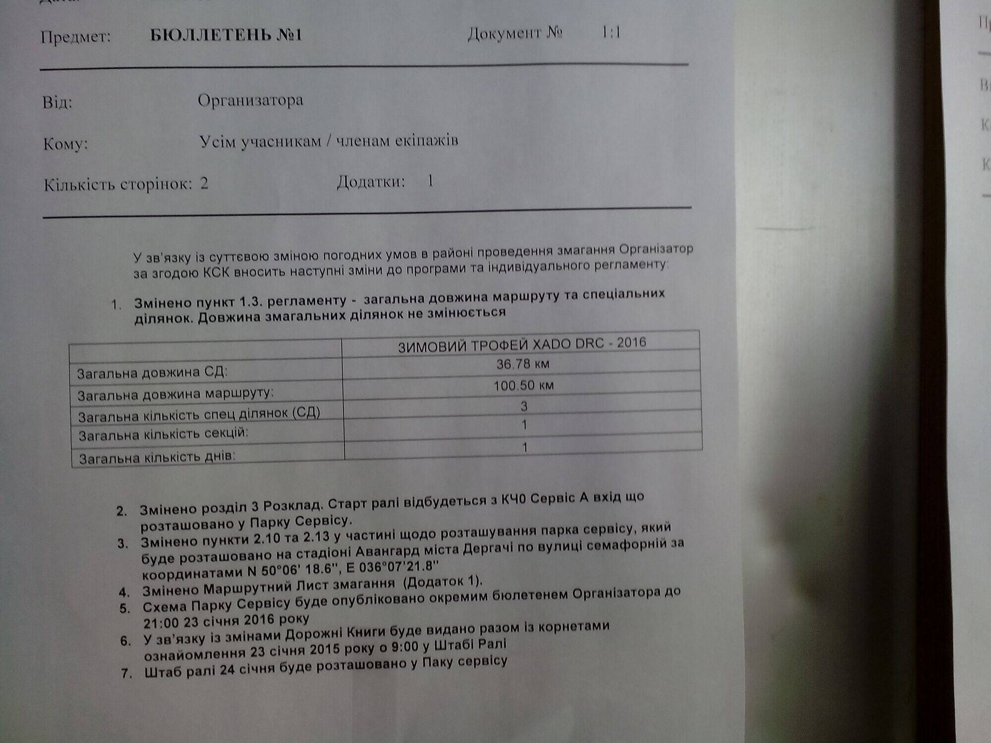 24.01.2016. Старт первого серийного авто в 08:15 на площади свободы г. Харьков в сторону г. Дергачи в сервис парк. Автомобили которые едут в Кубке с 07:00 выезжают с закрытого парка. Мотель Дружба в парк сервис. И до 09:00 Кубковые авто будут в парке сервиса. И до 09:00 приедут все серийные автомобили которые едут в трофее. Затем в 09:15 старт первого боевого авто. После кубкового канала, начнут ехать любители.