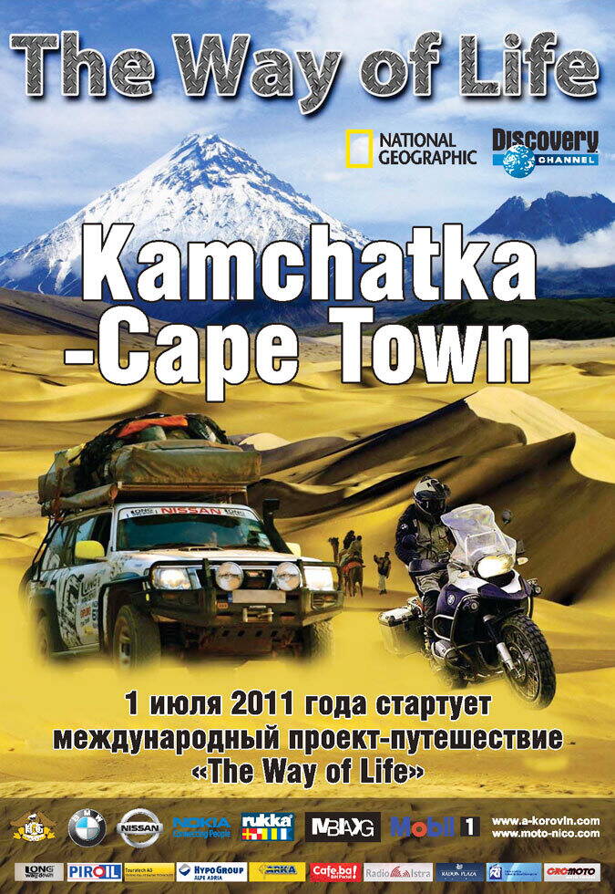 Два пилота на мотоциклах - Алексей Коровин (Украина) и Нико Маркович (Хорватия), и команда из 6 человек на джипах проедут по маршруту от Камчатки до Кейптауна 70 000 км за 10 месяцев. Телеканал Discovery снимет 46-серийный фильм об этом приключении. Канал National Geographic будет обеспечивать информационное сопровождение проекта.