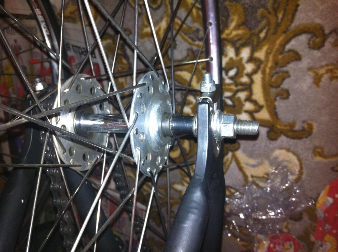 короче на заднем колесе не хватало длинны оси-пришлось поставить больше и с эдакой проставкой(фото ниже)