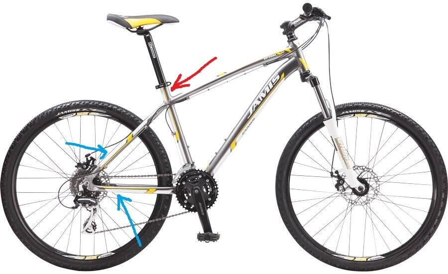 Вчера, примерно в 16 часов во Львове на ул. Тернопольской 13а возле игровой площадки у моего сына просто взяли и украли Треил Х2 купленый в мае. Поездить успел может раз 15. По велику: Jamis Trail X2 17" Monterey Grey, рама Y13A008672, вилка Gil 130108. Небольшие малозаметные потёртости на краске были на вилке и там где указал синими стрелками из-за несовсем бережного "кидания где попало" - а так состояние кулёк. Красной стрелкой указал место крепления замка Зефал - оно немного мешало регулировать седло.