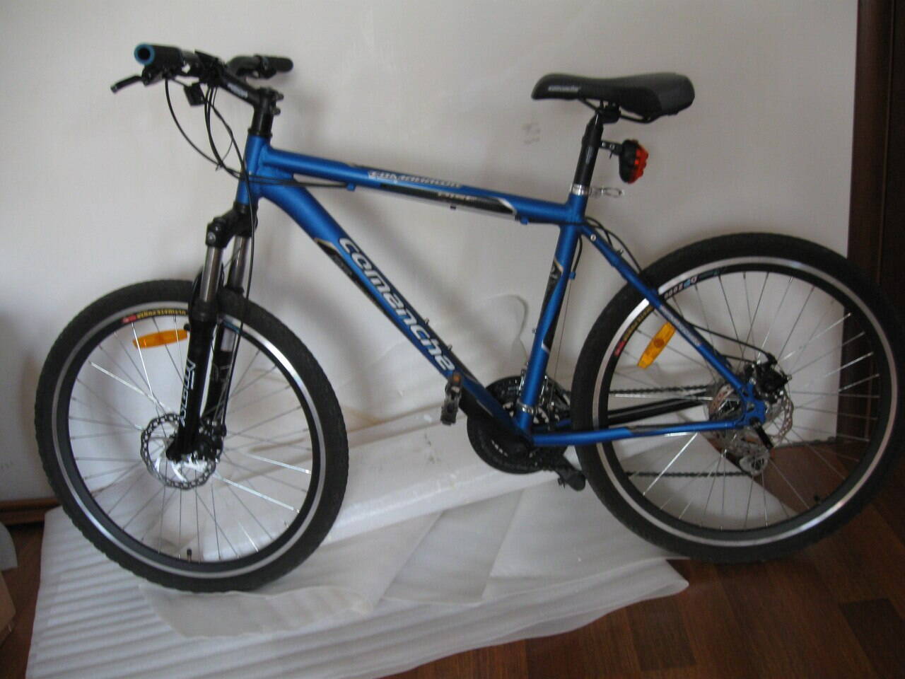 Задний красный фонарь снят, на заднем колесе колпачек на ниппель оранжевого цвета, дисковые тормоза, остался тросик спидометра без экрана, заглушек на руле нет.