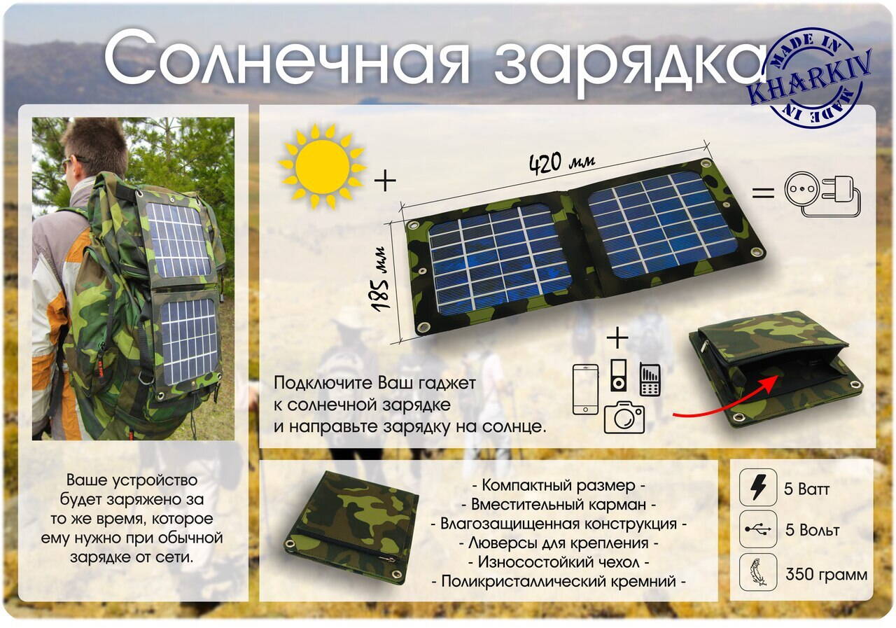 Солнечные зарядки подойдут для мобильного телефона, фотоаппарата, камеры, плеера, электронной книги, и других портативных устройств.