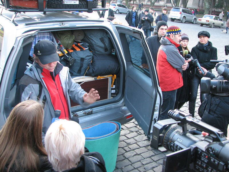 Старт состоялся 3-го декабря около 11-00. Провожающих собралось 20-30 человек. Было интересно послушать Андрея о планах и целях экспедиции в его подробном интервью для журналистов. Вадим немного стеснялся и краснел перед десятком видеокамер. Никакой помпезности и официоза! Только добрые напутствия знакомых и ... в путь-дорожку...