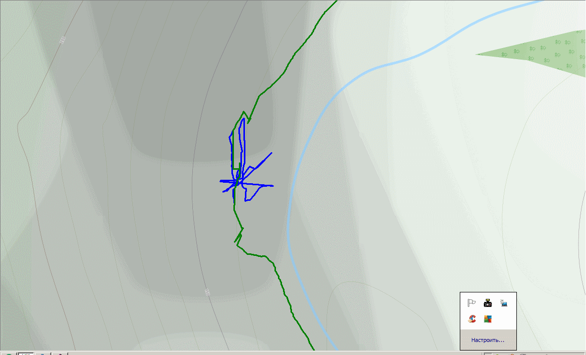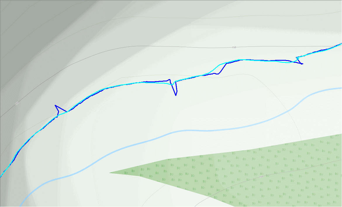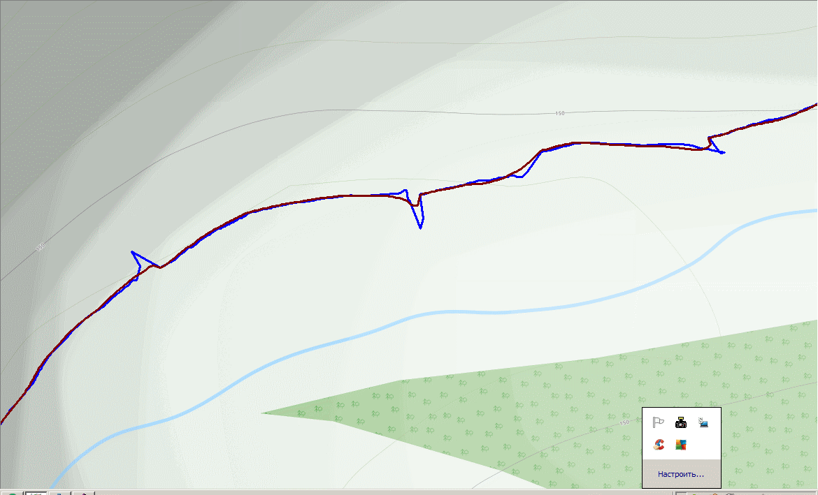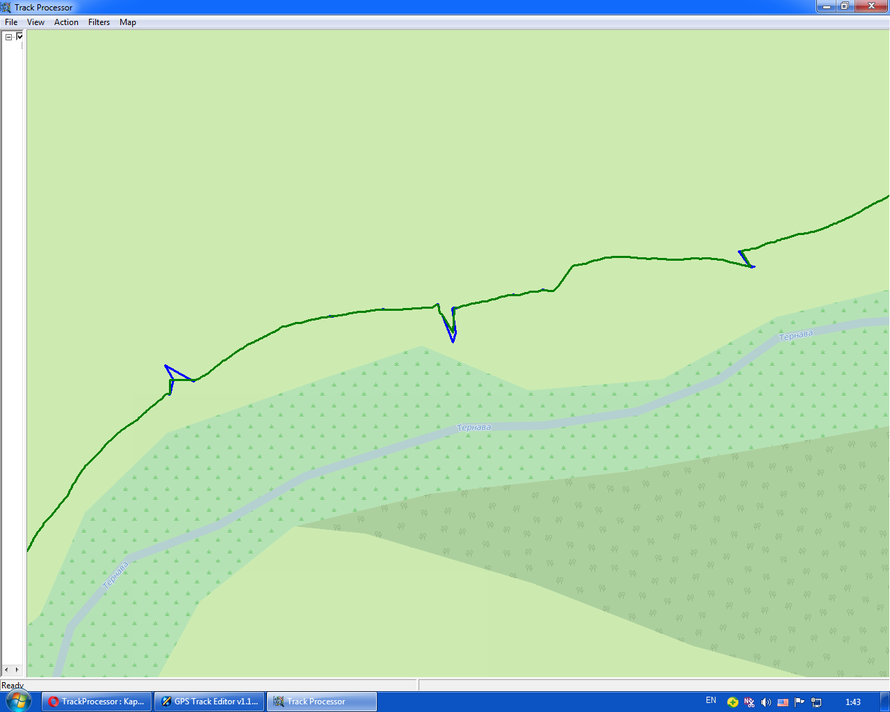 Теперь про срезание отдельных пиков. Привожу несколько скриншотов, используя вышеупомянутый трек. Взял кусочек, где мы шли по ровной грунтовой дороге без существенных изгибов, но на треке появилось несколько явных выбросов в сторону от основной траектории движения (напоминаю, мы шли по дороге и с неё не сходили).