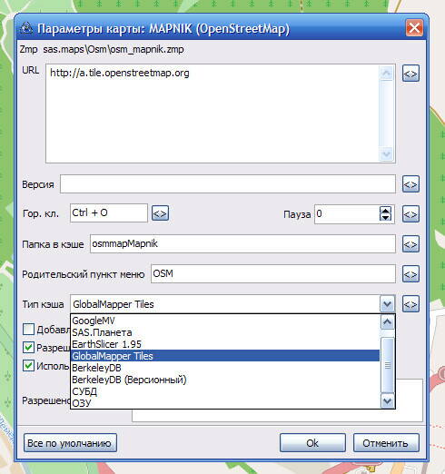 В открывшемся окне в поле "Тип кэша" выбираем значение "GlobalMapper Tiles".
