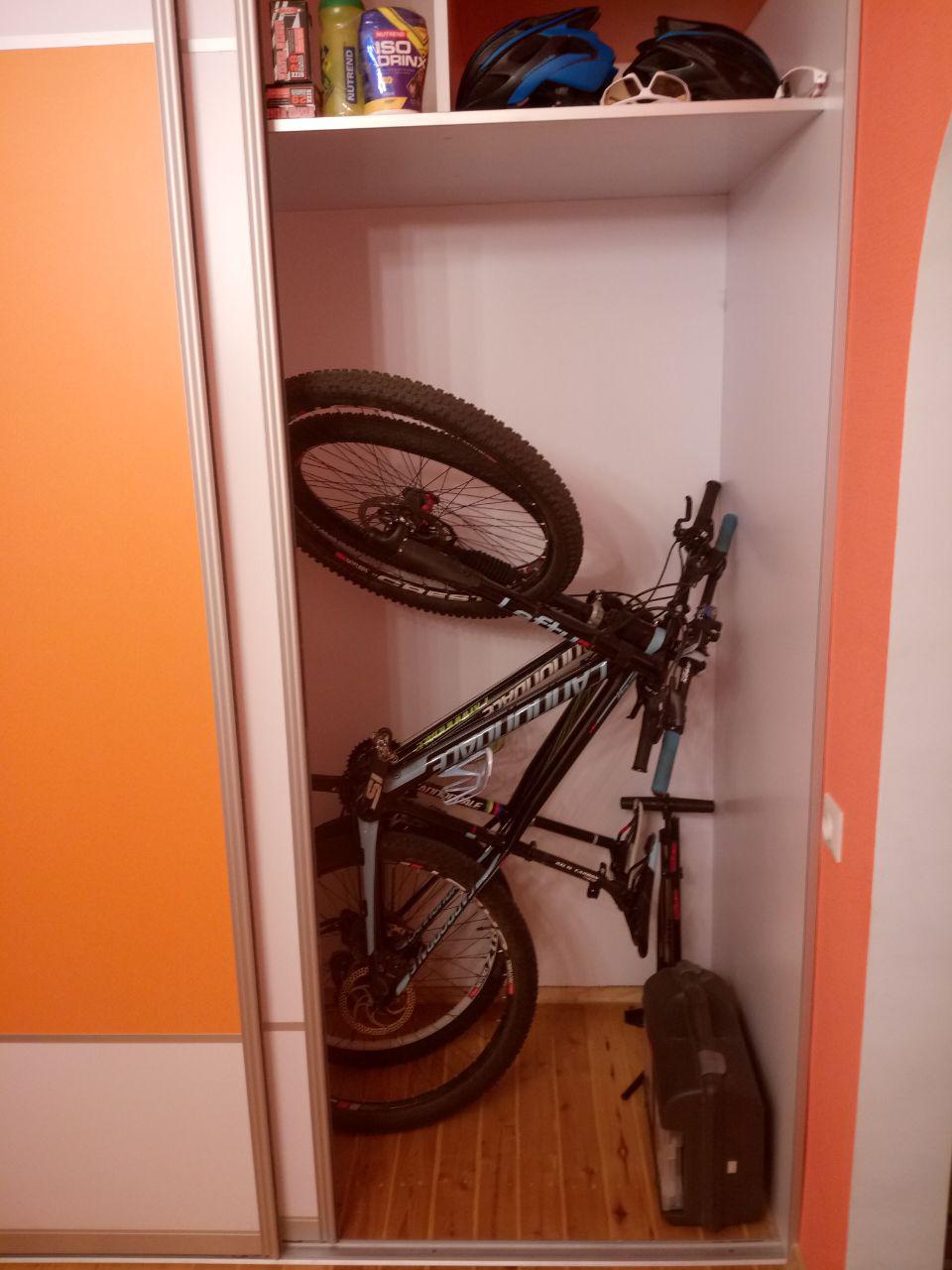 Я тоже планирую ставить шкаф для 2-х велов, однако у меня никак не получается выйти на ширину шкафа меньше 850 мм (ширину задают два руля по 685 мм) :sad: Еще вопрос: Ваши велы просто опираются на колёса или все таки как-то крепятся (на фото не видно креплений)?
