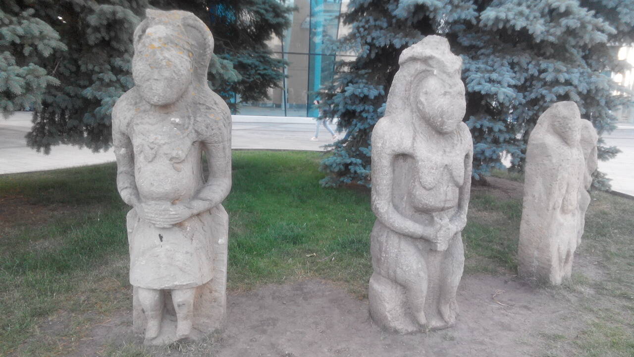 Раньше при въезде на территорию стояли скифские бабы, потом исчезли. Пропажу искали-искали, и нашли… Каким-то чудесным образом эти окаменелые тётки оказались в Краснокутском Дендропарке… (хорошо, что не у кого-то на даче)