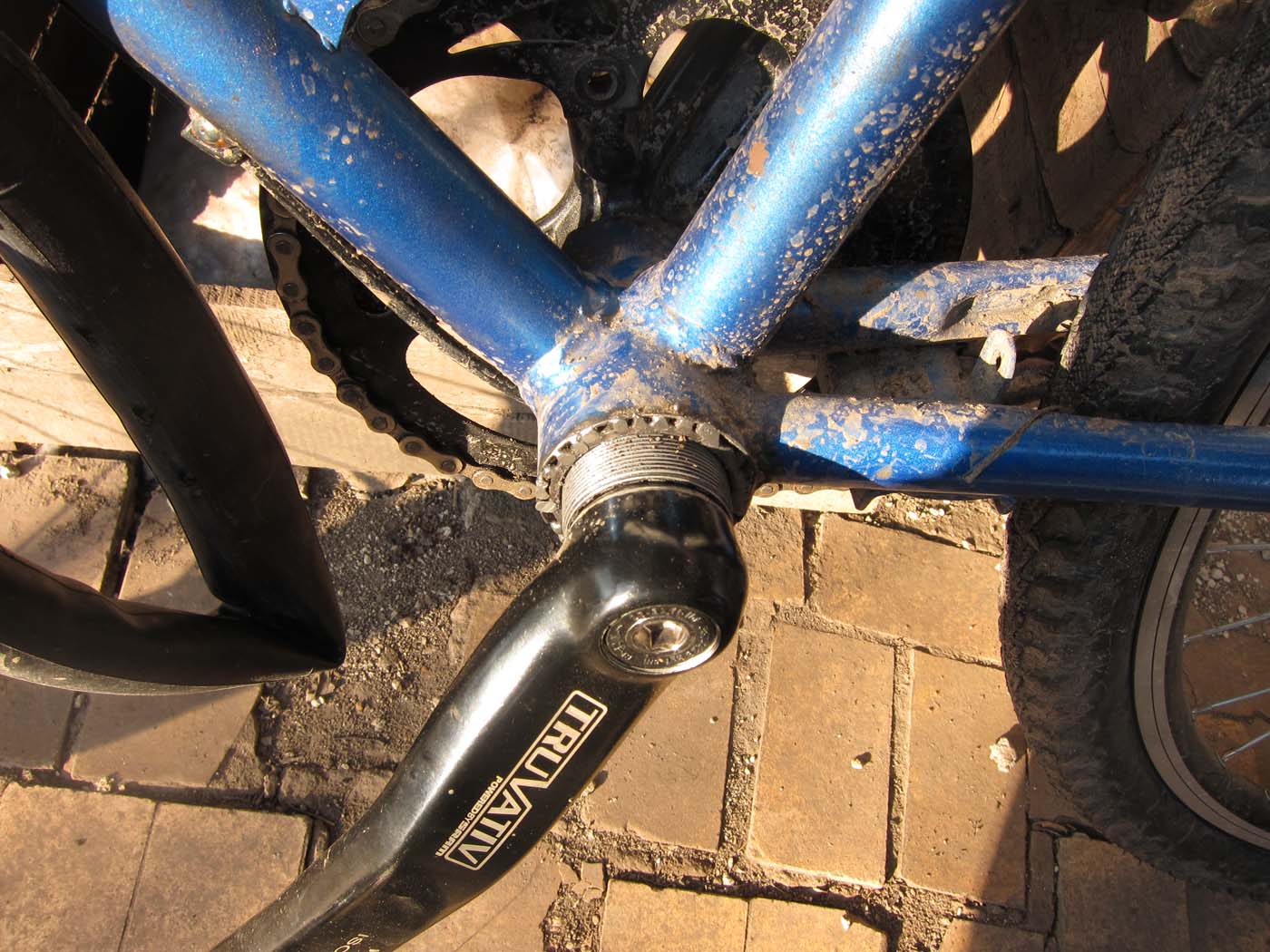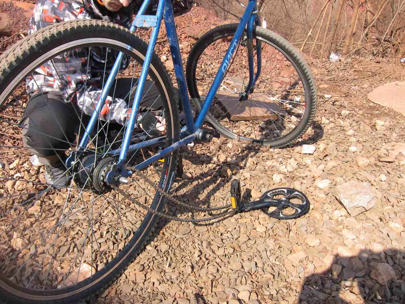 Выехал с другом, крутились педали вяленько после зимнего перерыва. Но в один прекрасный момент я стал понимать что педали крутятся ну уж совсем тяжело и моя физ подготовка тут не причем. Глянул в район каретки а там с правой стороны отвалился выточеный переходник а вместе с ним и вкрученая в него каретка, а с левой стороны чашка каким то образов вкрутилась в глубь милиметров на пять и сам шатун начал цеплять кареточную трубу и изрядно уже подсняло стружки с шатуна. Проблема с отпадающим переходником у меня уже встречалась, поэтому у меня в рюкзаке лежал инструмент для откручивания чашек и шатунов.