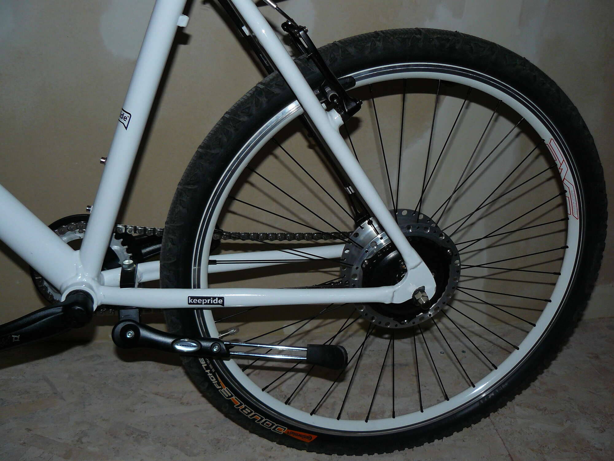7.Обода и спицы! тут начался гем...рой! Обода! исходя из концепции байка надо белые под V-brake! выбора практически нет - MACH1 EXE(180грн шт )- все что мог найти! Спицы, производитель рекомендует спицевать в 2 креста-по калькулятору надо спицу 202 мм(где ее такую найти еще и черную х его знает короче нету нигде! Пришлось спицевать радиально BMX спицами 194мм 48шт-будут на запас)!! не совсем по правилам для заднего колеса но пока уже 300км откатал нормально колесо держится восьмерок нет, яиц тоже, обод-спица-фланец втулки целие!к слову передние колесо тоже радиально заспицевал для симметрии!! Покрышки выбрал continental double fighter 2(пока выбором доволен, проколов нет, накат хороший), камера, флиппер -schwalbe-но тут хотя бы било из чего выбирать !втулка передняя Х17 На промахИтого если не врет калькулятор примерно 2800грн.