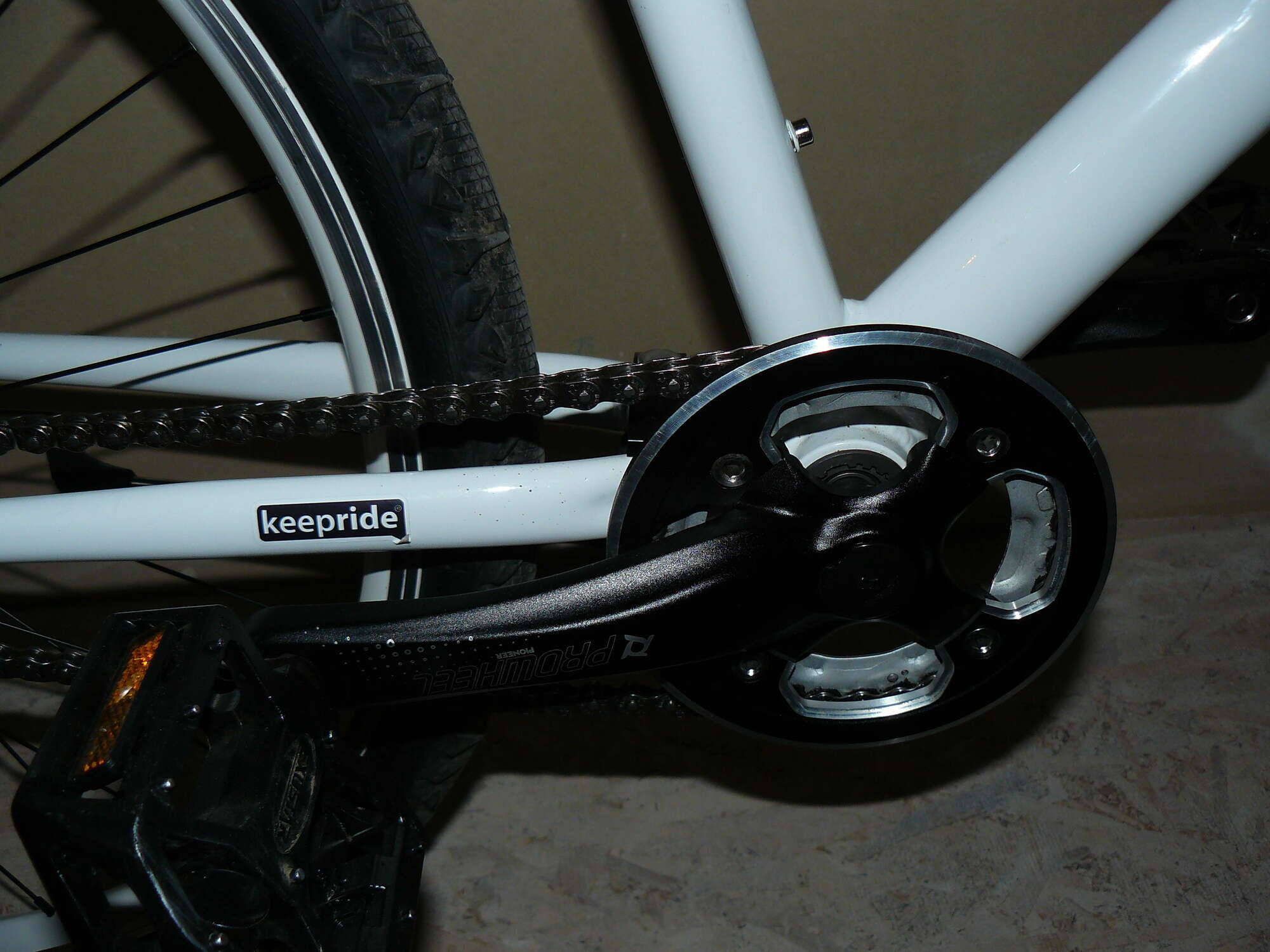 8.Звезди, шатуны, передаточные числа! Производитель сего девайса рекомендует чтоб передняя звезда била в 2 раза больше задней! Задняя - фривил бывает на 16 и на 18 зубьев! Следовательно ищем шатуны на одну звезду на 32 или на 36 зубов! ищем но ничего подходящего по цене не находим! в итогу куплены шатуны Prowheel Pioneer на 2 звезды 32и 22 зубчика тонкие зато из хромоля(380грн) соответственно меньшая била снята! каретка обычная VP-70грн, педали Exustar-80грн. Цепь!! - Повезло, обошлось без натяжителя обычной half link цепю YBN-100грн(как вияснилось цепь немножко растянулась поставил натяжитель fireeye spur-дороговато но прикольний . Потратил я на этом этапе уже примерно 470 долл -понял что в 500баксов не впишусь никак но отступать некуда -надо ити до конца!!!