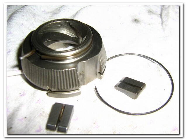 Дальше удобней работать,закрепив втулку в тисках вертикально.Устанавливаем большую пружину и подшипник(просто ставим-и всё):