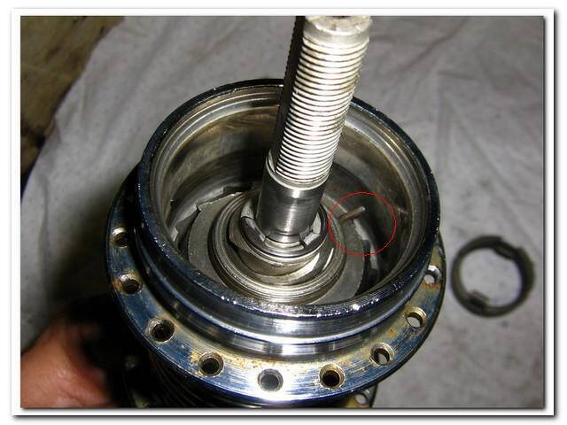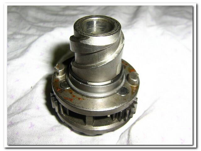 Специально изготовленную шайбу надо будет установить вместо кольца с буртиком,которое удерживает на своём месте оси планетарных шестерён.Зафиксировать вновь установленную деталь можно уже имеющейся стопорной пружиной: