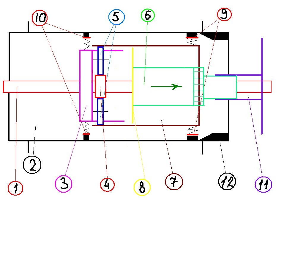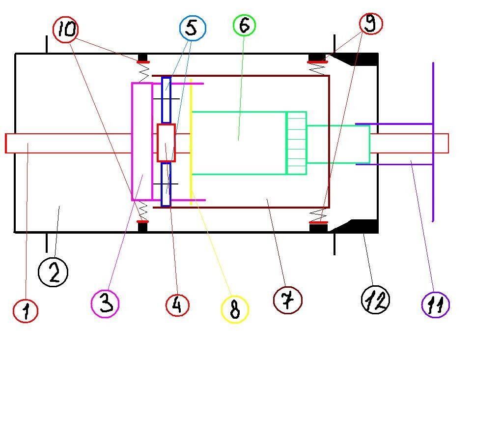 Теперь тросик передвинул кроме втулки-ползуна 6 ещё и внешнюю звезду 7 наружу.При этом собачки 9 упёрлись в пологий буртик 12(я обозвал это место "парковочной зоной) на корпусе втулки и приподнялись,выйдя из зацепления с корпусом(скользят по парковочной зоне).Сейчас вращение от задней звездочки,закреплённой на промежуточном конусе 11 передаётся через шлицевое соединение втулке-ползуну 6.От него,через,опять же шлицевое соединение-внешней звезде 7,и далее на внешние стороны планетарных шестерён 5.Шестерни,своей внутренней стороной прокатываясь по зубьям 4 вращают водило 3,приводя его в движение через свои оси с указанным выше понижающим коэффициентом скорости.Водило передаёт своё вращение корпусу втулки через собачки 10.