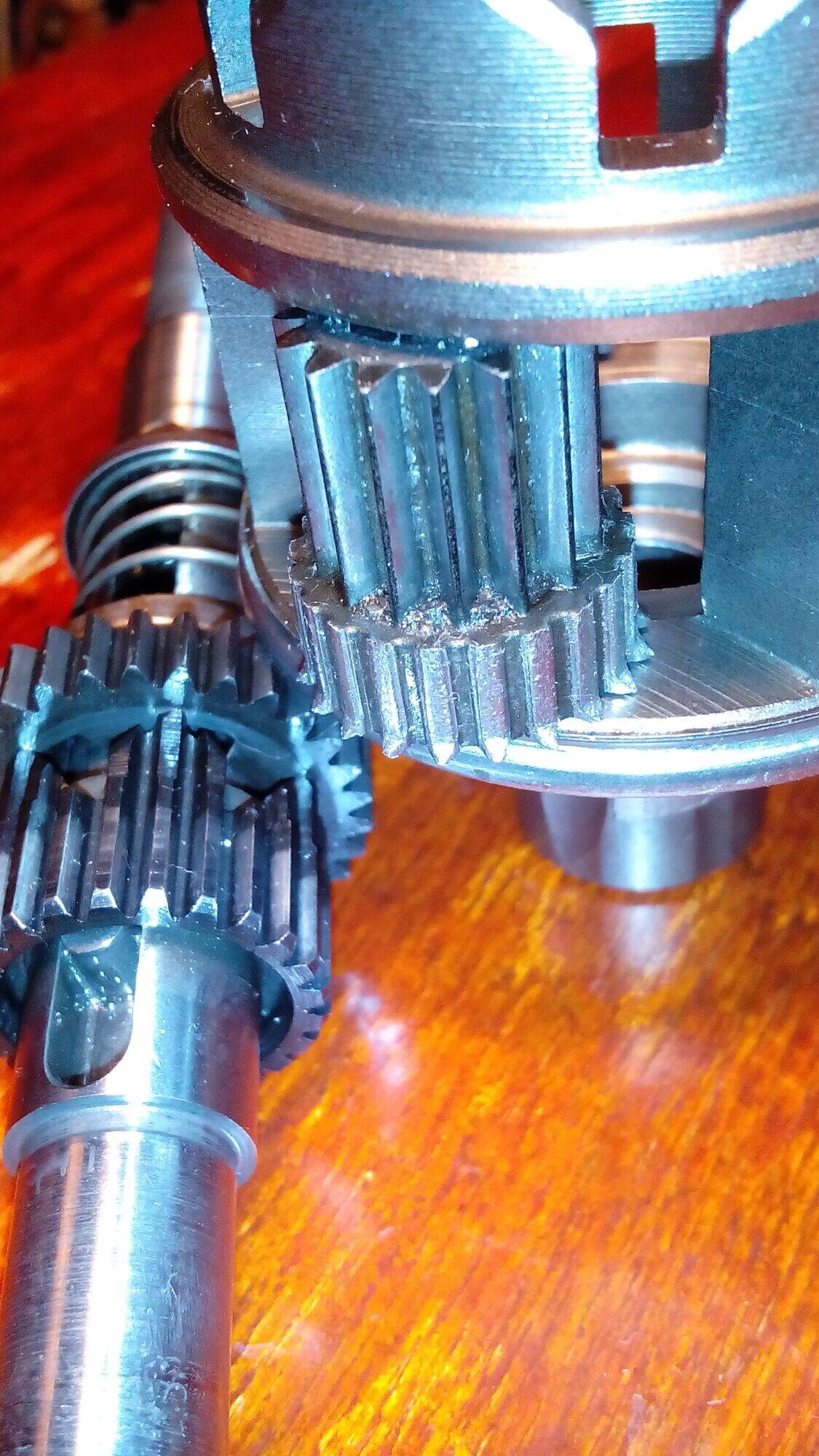 При осмотре оказалось что зубья на малой солнечной шестерни и бОльших сателлитах зализаны, т.е. зацепление между ними прямо говоря хреновастенькое. Забыл напильничком попробовать шестерни - может "сырые"?
