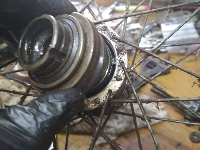 Разборку начал со стороны тормозной лапки. снял лапку, снял барабан с подшипником,колодки
