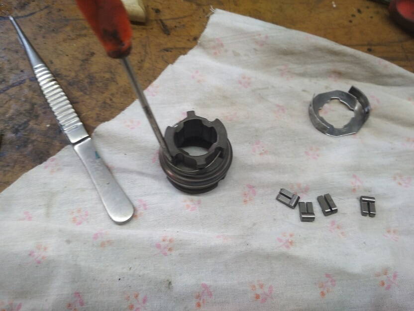 Далее надо снять основной блок. Он на резьбе. Ставим отвертку в прорезь и ударяем молотком, дальше сам открутится. под ним блок собачек.