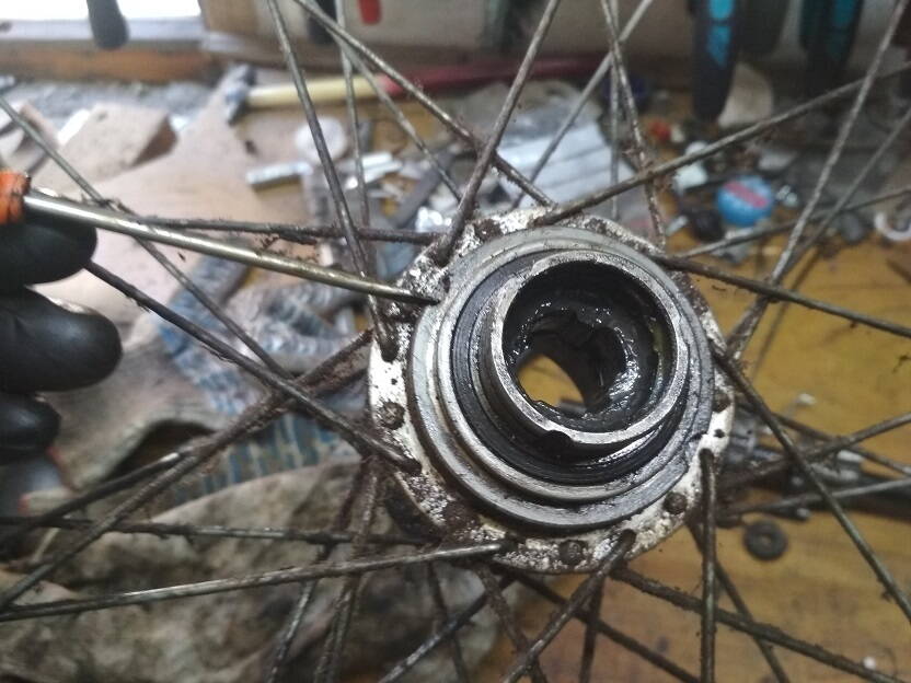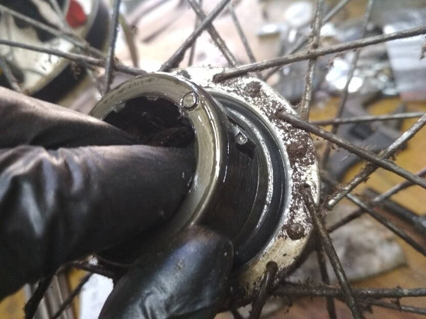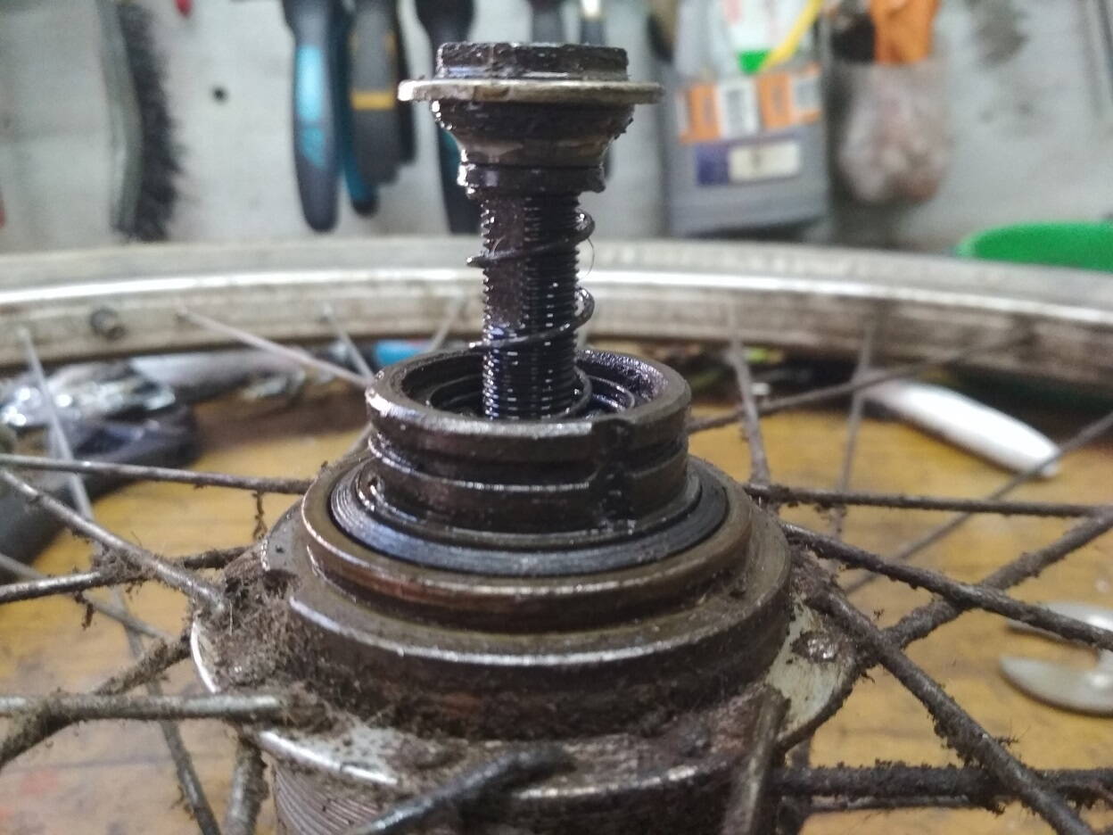 Разборку начал со стороны тормозной лапки. снял лапку, снял барабан с подшипником,колодки