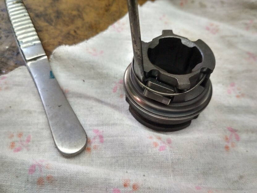 Далее надо снять основной блок. Он на резьбе. Ставим отвертку в прорезь и ударяем молотком, дальше сам открутится. под ним блок собачек.