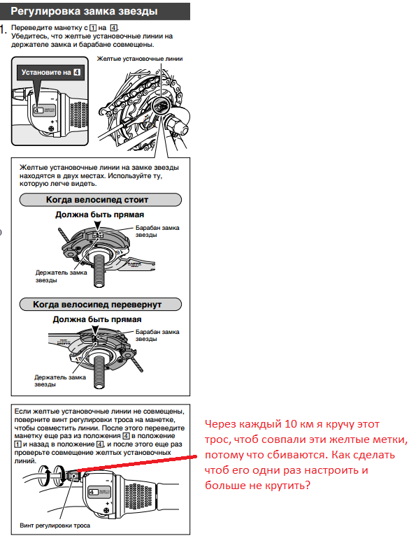 1) Постоянно сбивается настройка втулки. Согласно инструкции на 4-ой скорости, на втулке должны совпадать две отметки. Так вот я их выставляю...