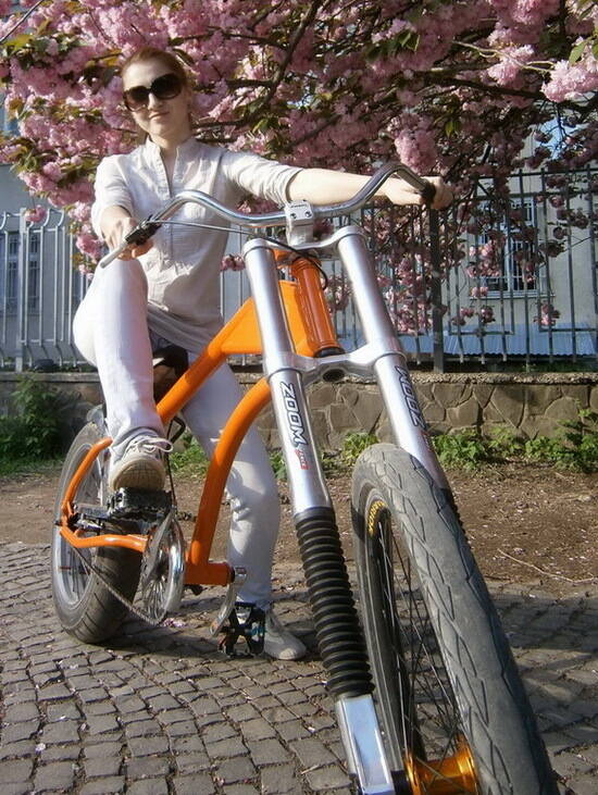 передняя вилка зум перевертыш, рама от эксклюзивного алтрикса перекрашена но мои вкус, руль от круизера какого точно не помню =) Центральная ось переделана под промы, седло переварено для более удобной посадки =) Вот только незадача с передачами, если ставить касету то надо варить под петух крепление, если ставить планетарку то надо решить вопрос устойчивости колеса на втулке меньшего диаметра чем сам диск, да и планетарка с ручным барабанным мне бы больше подошла, но елс и уже ни в какую то придется варить крепеж под диск, но это тоже не так сложно, просто перекрасить еще раз потом надо будет и вуаля...