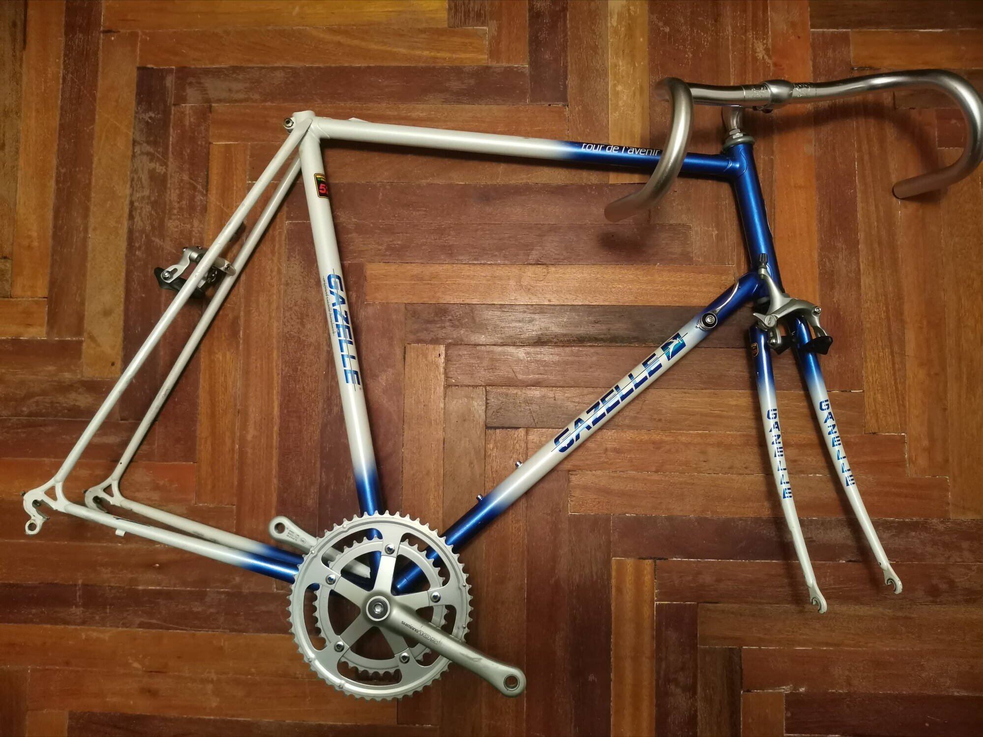 Года три назад, мне посчастливилось взять фреймсет чистокровного шоссера, на трубах reynolds 525, голландского национального велопроизводителя - Gazelle. Какого года, мне неизвестно, потому и обвес данного байка для меня - тайна. Знаю что трансмиссия была на нем семискоростная, согласно надписи на заднем пере. Помимо имени велопроизводителя на борту рамы, гордо красуются еще две: "tour de l'avenir" и "original Gazelle handwork".