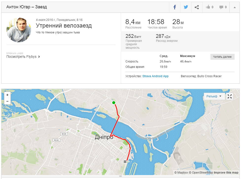 в субботу вот ездил с друзьями в Запорожье. Вышло 102 км вкручивания (обратно в Днепр транспортом добрался). По передачам. Только выехал из дома и левый дуал перестал переключаться((( Максималку выжал с горки 52(не совсем выжал. Накатом). По прямику я обычно использую примерно 52х17 - 52х18. Точно кол-во зубьев не считал. Руководствуюсь физическими ощущениями, пытаюсь следить за каденсом. Катаюсь в основном в верхнем хвате или "на дуалах". Средняя по городу 25-27км/ч. В колесах по 6 атм. Чувствую себя отлично на асфальте и тд.