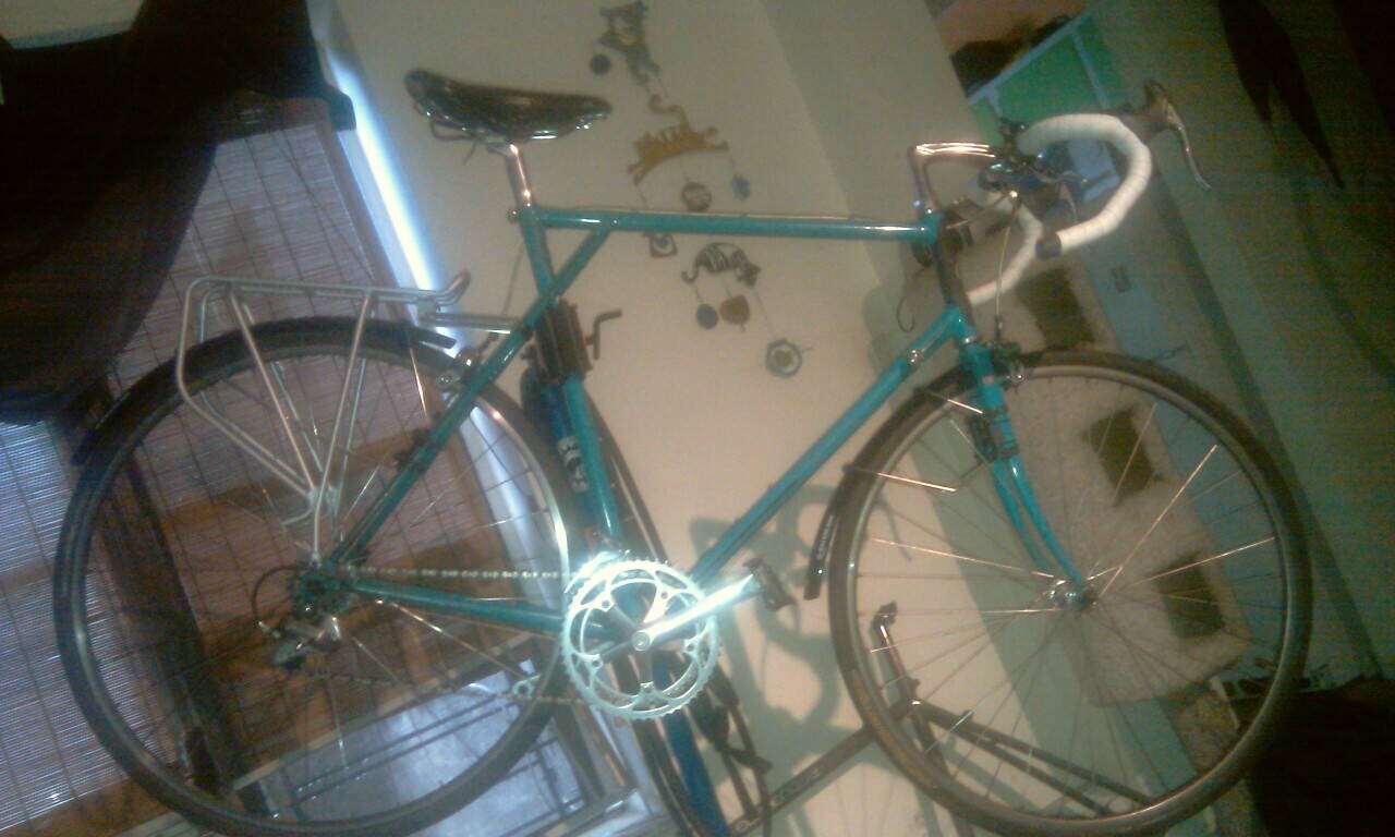 Рама/вилка Colner (вторая марка Colnago во времена когда UCI разрешала спонсорство только одной команды), 54 см, задние перья частично хромированы, вилка частично хромирована, краска родная. Итальянская каретка (сейчас установлен Nadax Favorit), рулевая Campagnolo, судя по весу фреймсета с кареткой и рулевой трубы неплохие (если принять внимание ростовку, то можно даже думать что могли бы быть и SL вполне). Дропы рамы и вилки - Campagnolo. Если исходить из периода, когда Colnago делал их для профессиональных команд - то примерно 72-78 год (к 80му и позже проводка над кареточным узлом уже практически не использовалась как мне кажется).