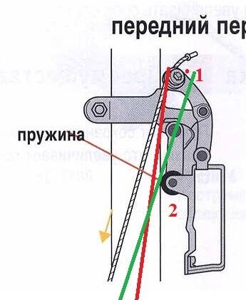 Посмотрел я на "это все дело" еще в тысячный раз. Красным мой подвод тросика . Когда перекидка находится на малой звезде, то место крепления тросика (1) расположено относительно подседельной трубы дальше, чем ось пружины. Тоесть фактически, трос тянеться не в сторону-вниз, а тупо вниз. Очень острый угол, условно "усилие идет не на перемещение рамки, а на стяжку перекидки вниз по подседельной трубе". Как-то так.