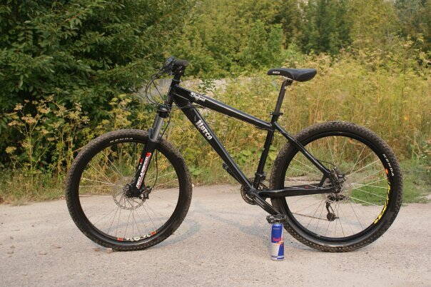 руководствуясь постами разных психов с х-байкеров рискнул, и поставил на него вилку сантур "рукс" 150мм(Но тут еще надо учесть что рукс все таки воздушка, и за счет сэга, по определению большего чем на пружинке, она просаживается, так что думаю, стакан выдержит). при этом, несмотря на то что ход вилки больше заявленного производителем на 30 мм провис каретки составляет порядка 25 мм. Минимальный ход вилки для этой рамы наверное все таки около 100 мм, например, такой ход указан в каталоге драйв-спорта, который завозил "норки" в Харьков за 2007 год. Больший чем 150 ход вилки, мне кажется для этой рамы страшно ставить. "норки" 7 года, и "бигфут" в частности, хвалят за неубиенность, но все имеет свои пределы, и стакан у бигфута слабее чем у старших нс моделей. Эвил империал(спасибо andr=) ) с супер-монстром, да, клево смотрится=)) только весит как танк=)