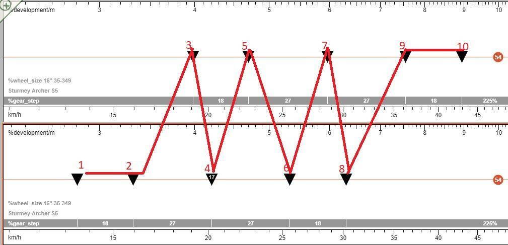 По данному конфигуратору я не нашел, где можно посмотреть показатели "скорость при каденсе 80 на 10-скоростном Броме", поскольку в вашем графике там при трансмиссии на базе втулки Sturmey Archer S5 (пятискоростной) и колесах 16" передняя звезда 54? Я, возможно, не очень правильно интерпретирую.