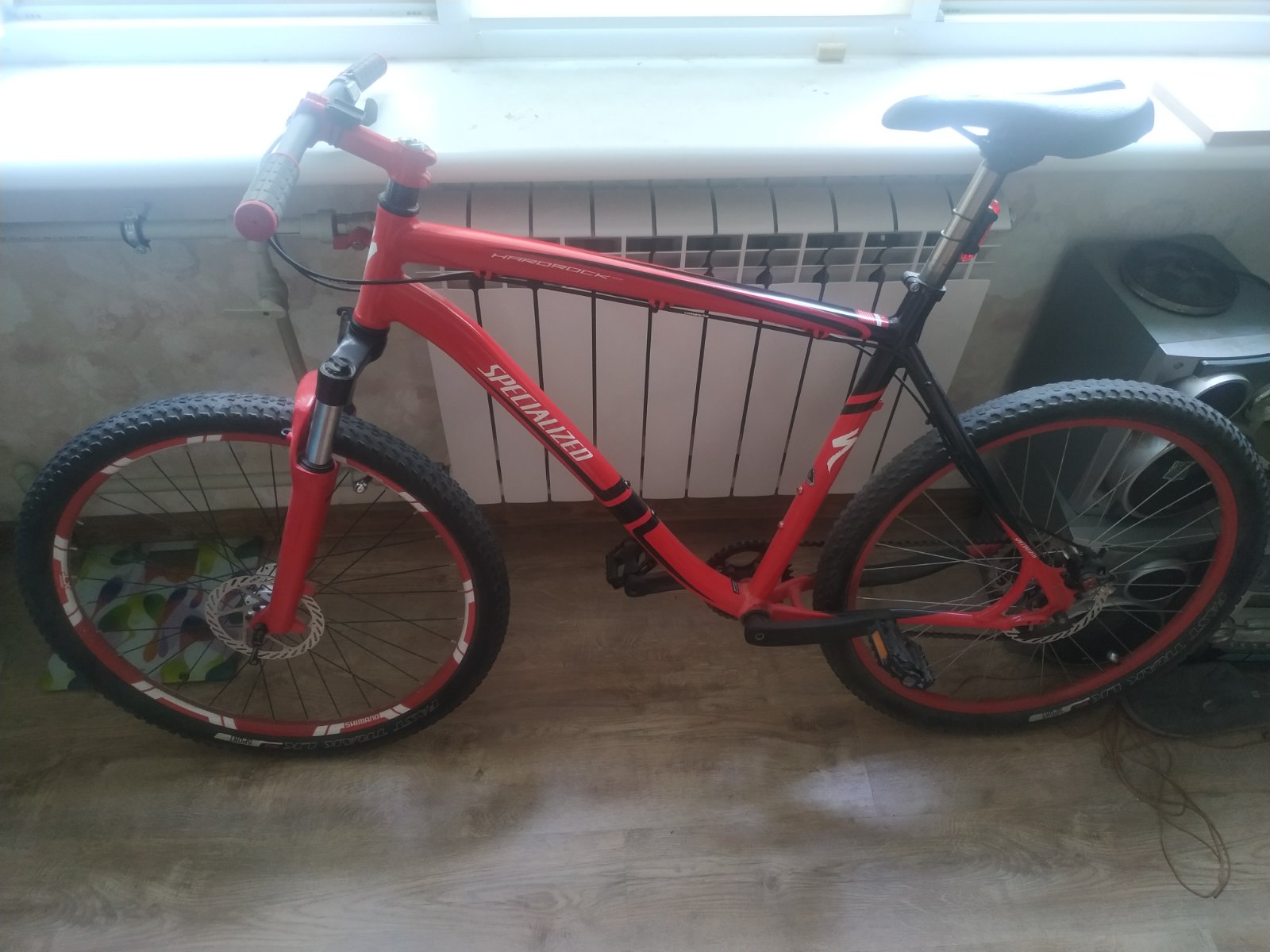 С документами. Ездил очень бережно, рама не варилась. Заменено седло на более удобное, задний тормоз с Avid BB5 на BB7, заменены передние 3 звезды на 1 овальную narrow wide, заменен руль с изогнутого на ровный, переднее колесо полностью переспицовано (установлена новая оригинальная втулка Novatec).