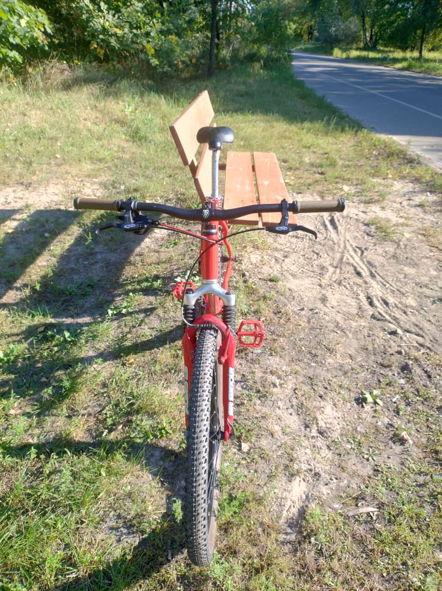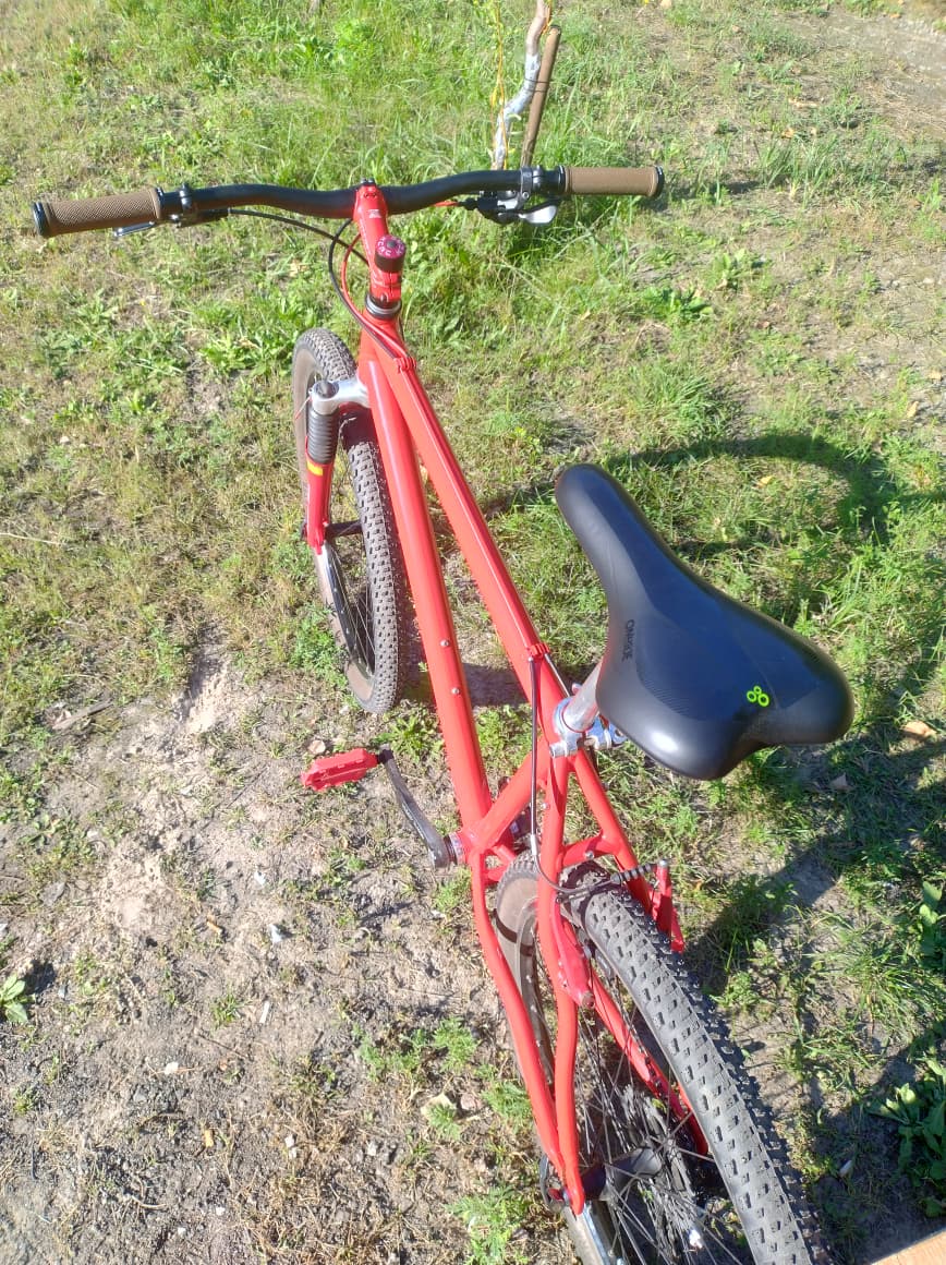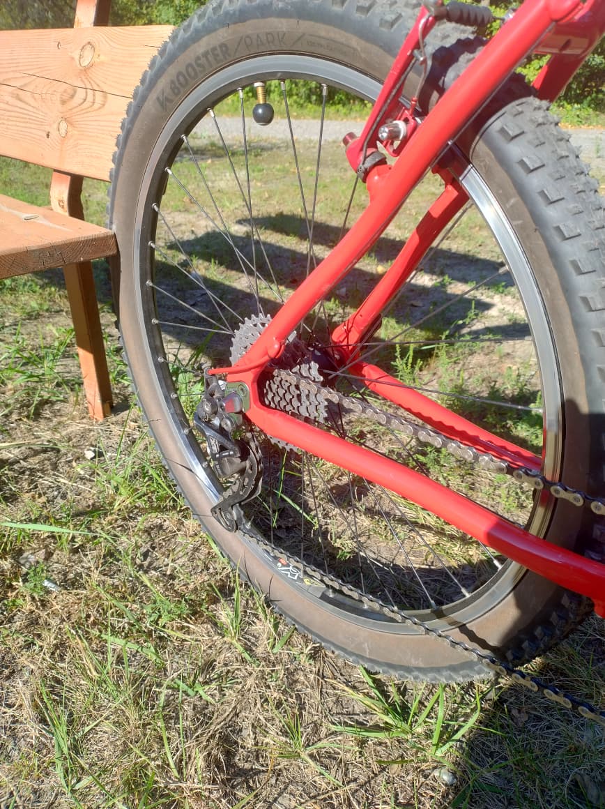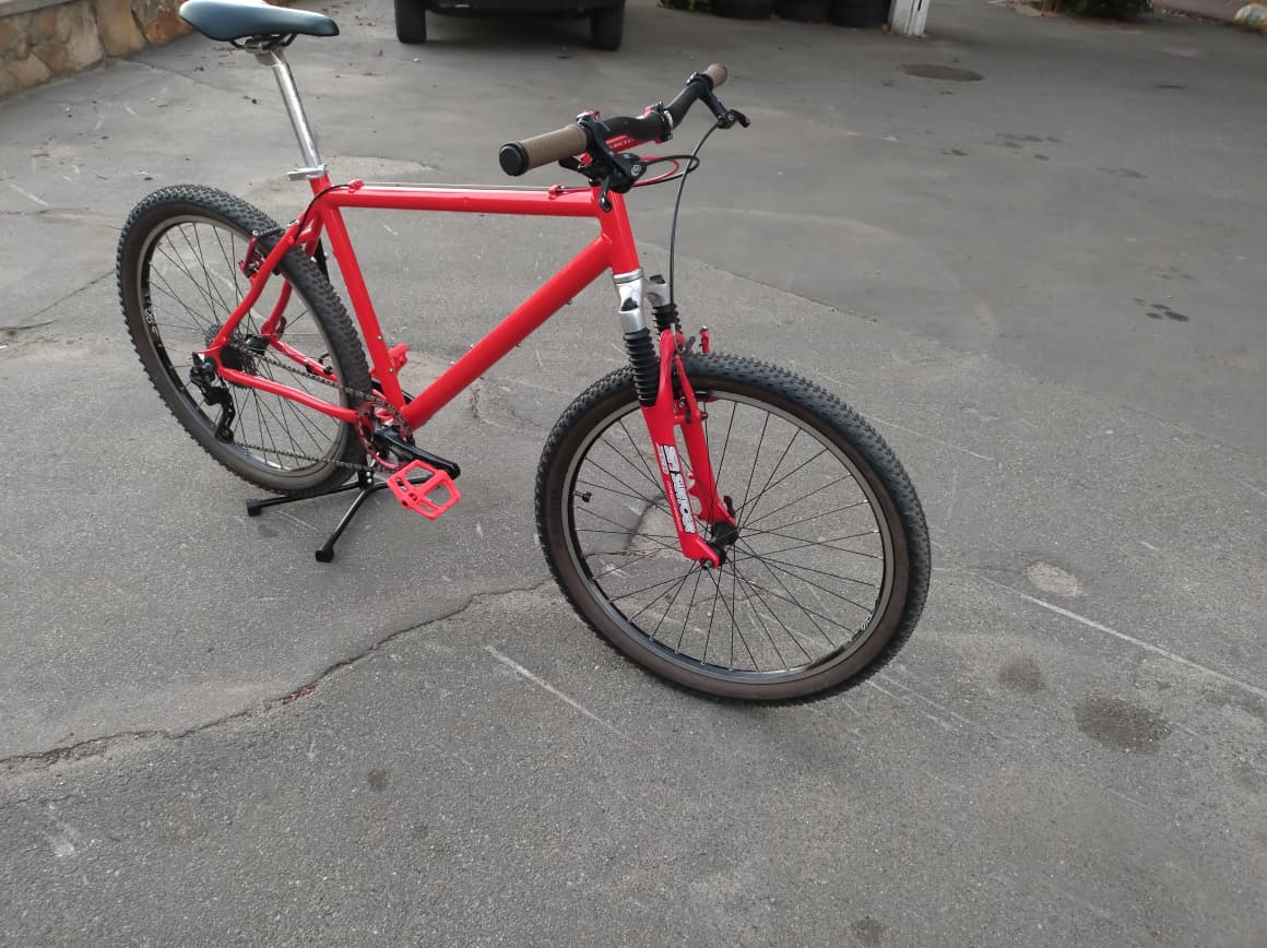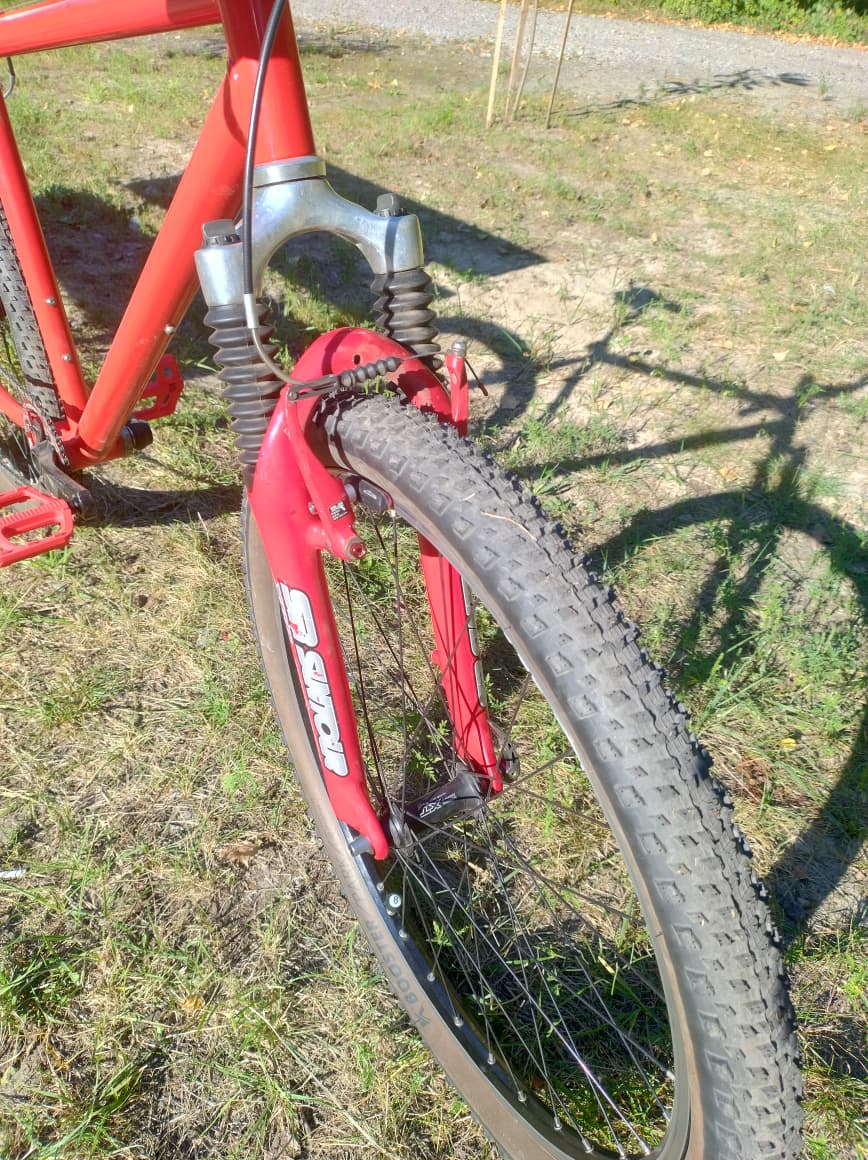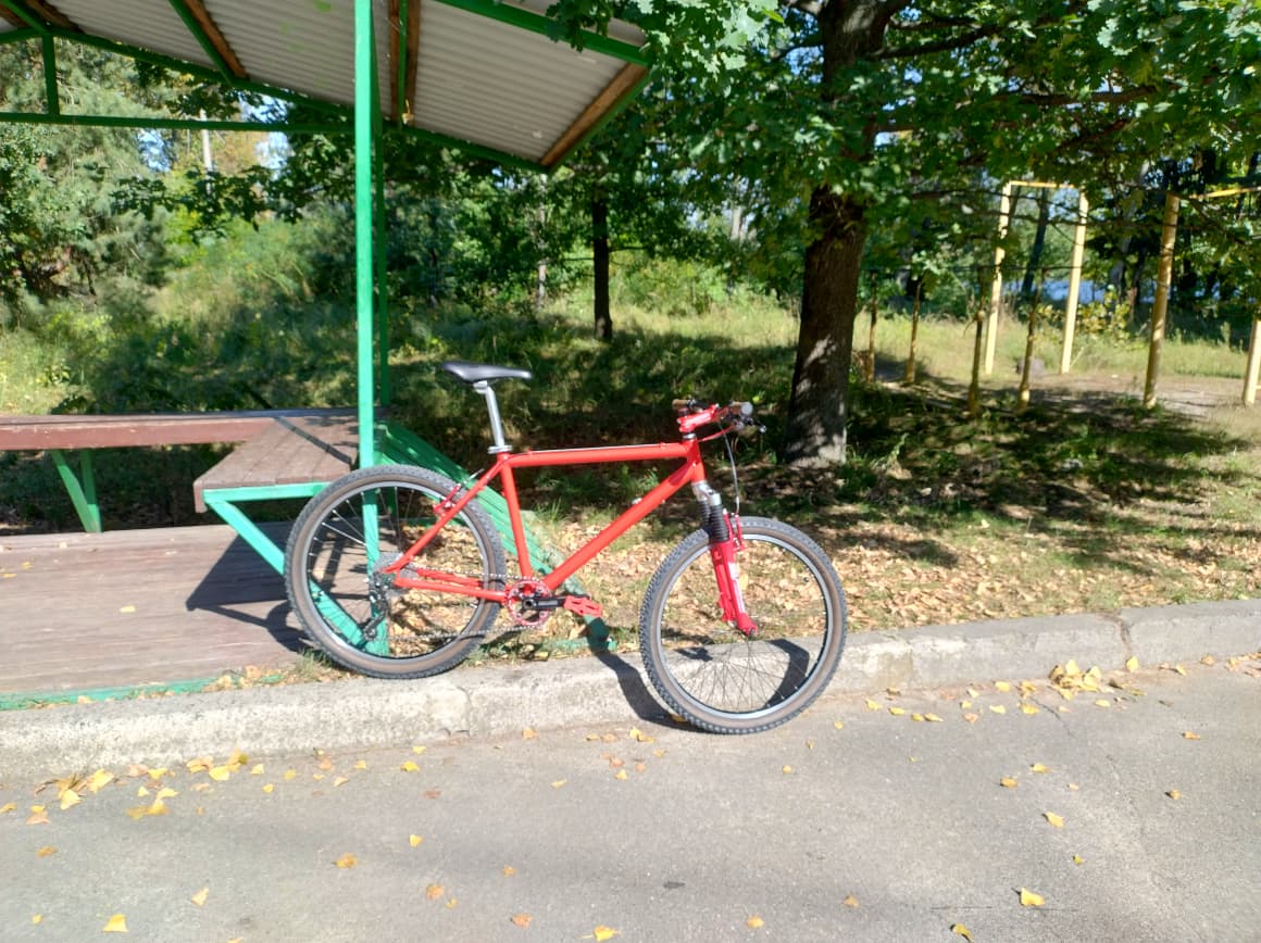 Продам велосипед на базі рами Exotec Comp. Рама 90х років з алюмінію, вагою 1700 грам. Багато кріплень на рамі, для фляготримачів, крил (навіть для переднього), багажника, а також для заспокоювача ланцюга. Рідний колір зелений переливаючий, але зовнішний вигляд був не дуже, тому раму перефарбував у червоний, порошковою фарбою, колір підбирався згідно відтінку вже наявних червоних деталей, тому виглядає як одне ціле. Невеликй нюанс, на вернхній трубі маленька вм'ятина, помітив вже пілся фарбування, на ходові якості не впливає.