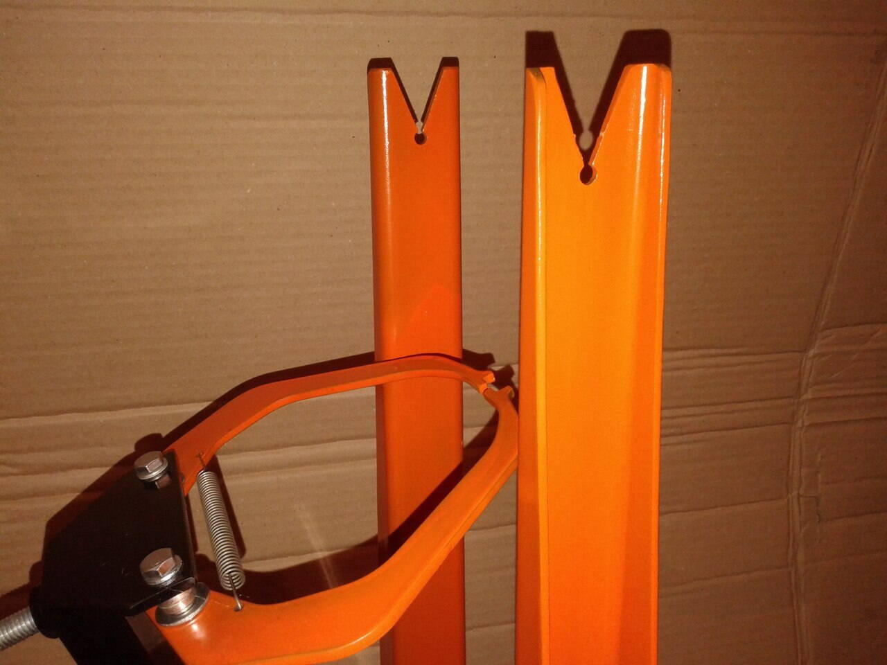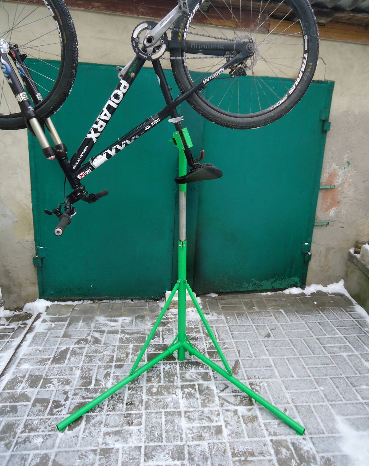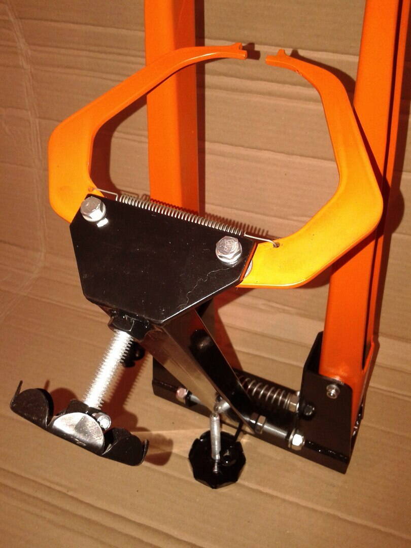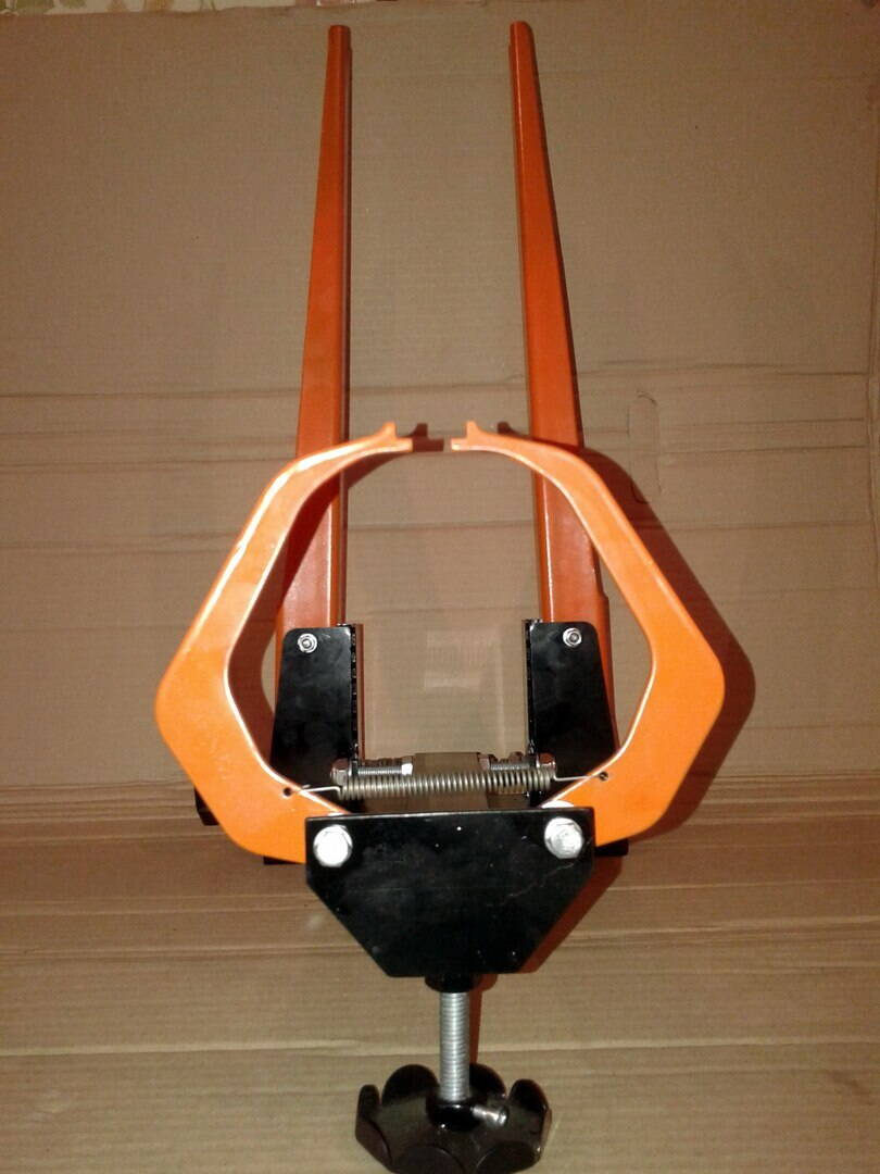 Ремонтная стойка для велосипеда изготовлена из стальных тонкостенных труб, имеет вес порядка 8 кг, выдерживает нагрузку до 100 кг. Благодаря дополнительным упорам конструкция имеет избыточную жесткость. Разбирается на составляющие длиной не более 80см. Имеет регулировку по высоте в диапазоне от 90 до 150см. Лапа работает по принципу зажима «третьей руки» или сварочных клещей, что одно и тоже. Вращается вокруг оси на 360 град и ее положение фиксируется с помощью эксцентрика. Губки лапы сменные, фиксируются винтами и выполнены из мягкого пластика, чтоб не царапать обжимаемые детали. Можно захватывать трубы от 25 до 40мм. Цена 2000 грн
