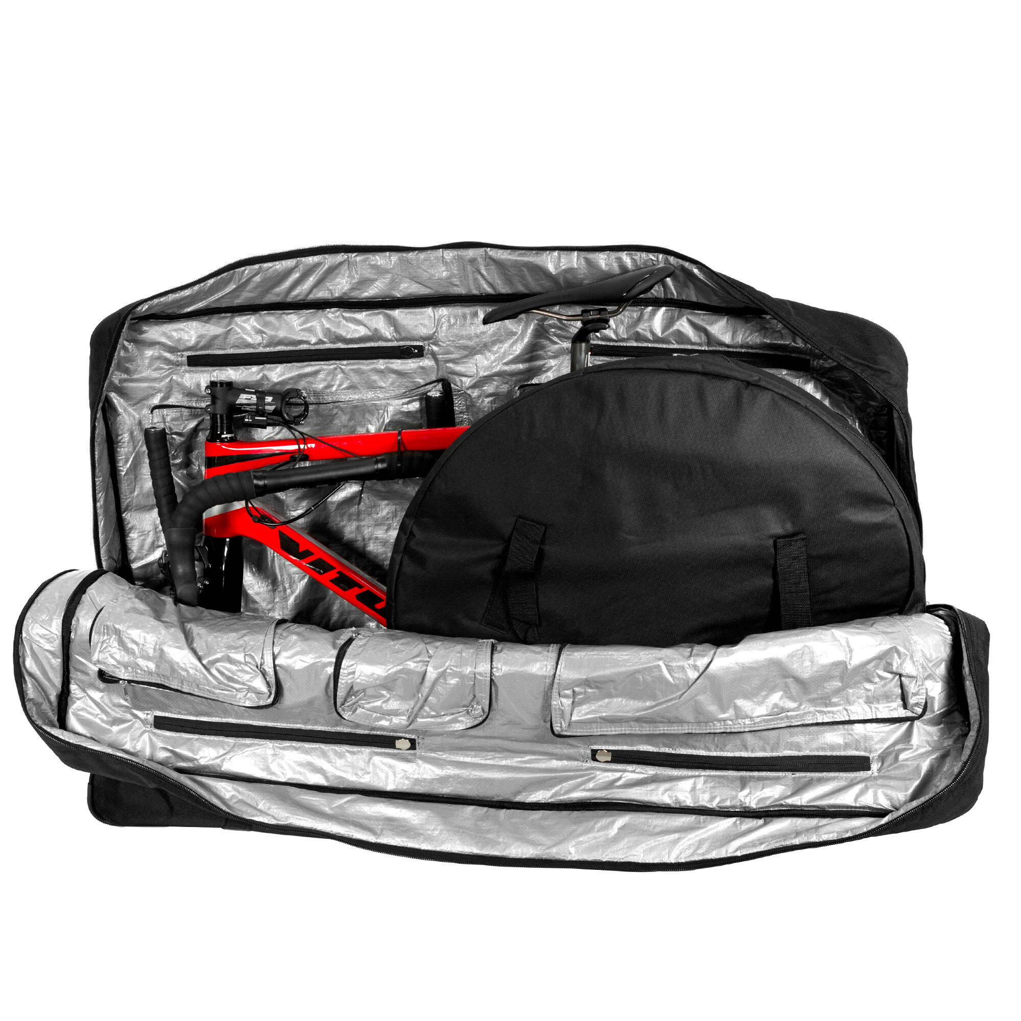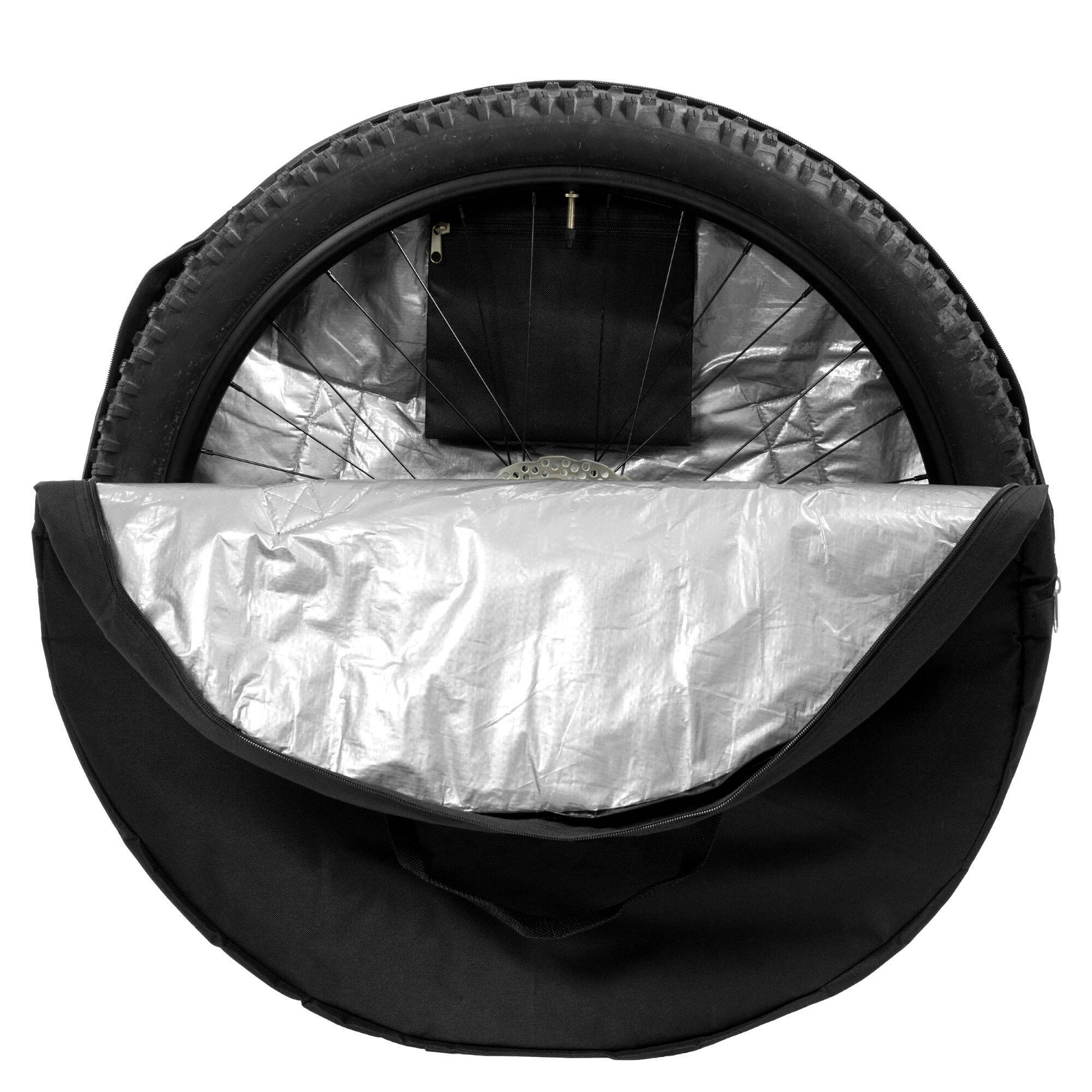 Сумки для колес изготовлены из того же сверхпрочного материала, что и основная сумка для велосипеда, их можно использовать с так и без плечевых ремней или укладывать в сумку для велосипеда. Внутренняя часть колесных сумок имеет отдельное отделение для хранения эксцентриков и осей, в центре сумок размещены 2 прочные диски из ПВХ, чтобы ось не выпирала, а колесные гайки не прошли сквозь внешнюю сторону сумки.