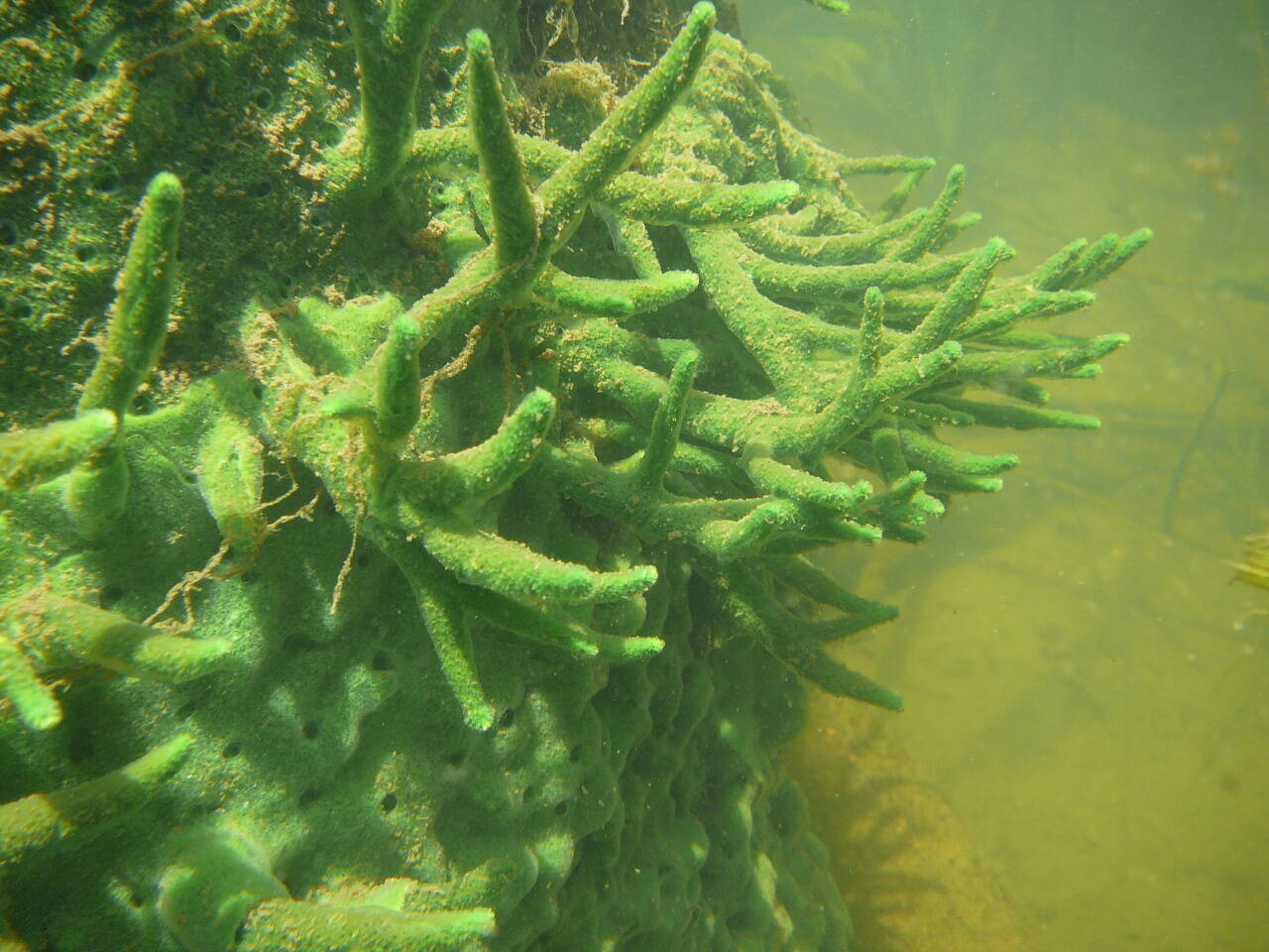 Это губка бодяга - наш местный пресноводный представитель Типа Губки, беспозвоночное животное, ведущее прикрепленный образ жизни. Одно животное путем почкования образует такую вот ветвистую колонию, как на фотографии. Зеленый цвет губке придают водоросли, живущие в полостях ее тела.