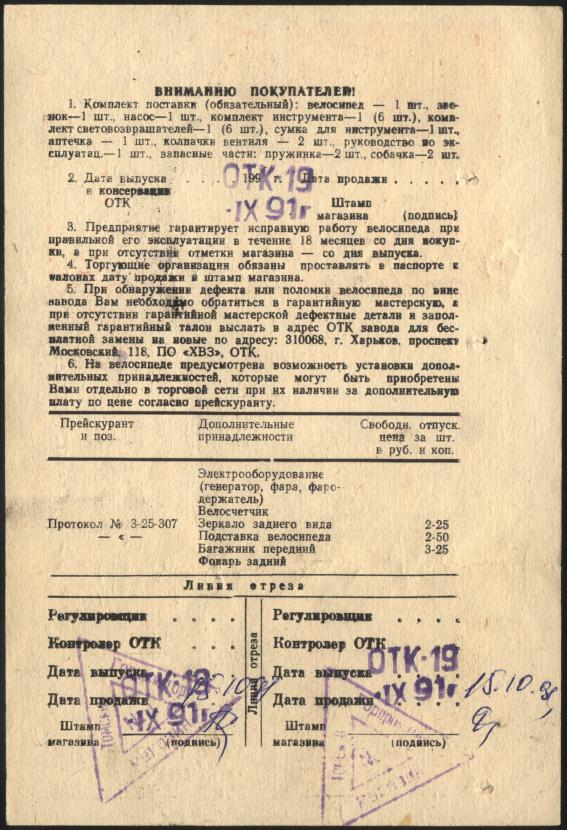 У моего экземляра (номер 208111, 1991 год), была более резкая расцветка: светло-зелёный, а ближе к точкам соединения труб - красная, с плавными переходами. Надписи в виде наклеек. Кроме того в комплекте не было фары с динамкой и переднего багажника, хотя ушки на вилке были. Поэтому передний багажник поставил сам, не знаю от какого велосипеда.