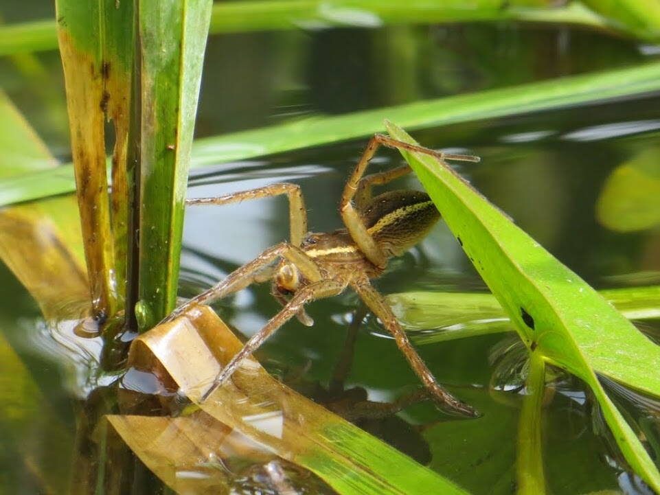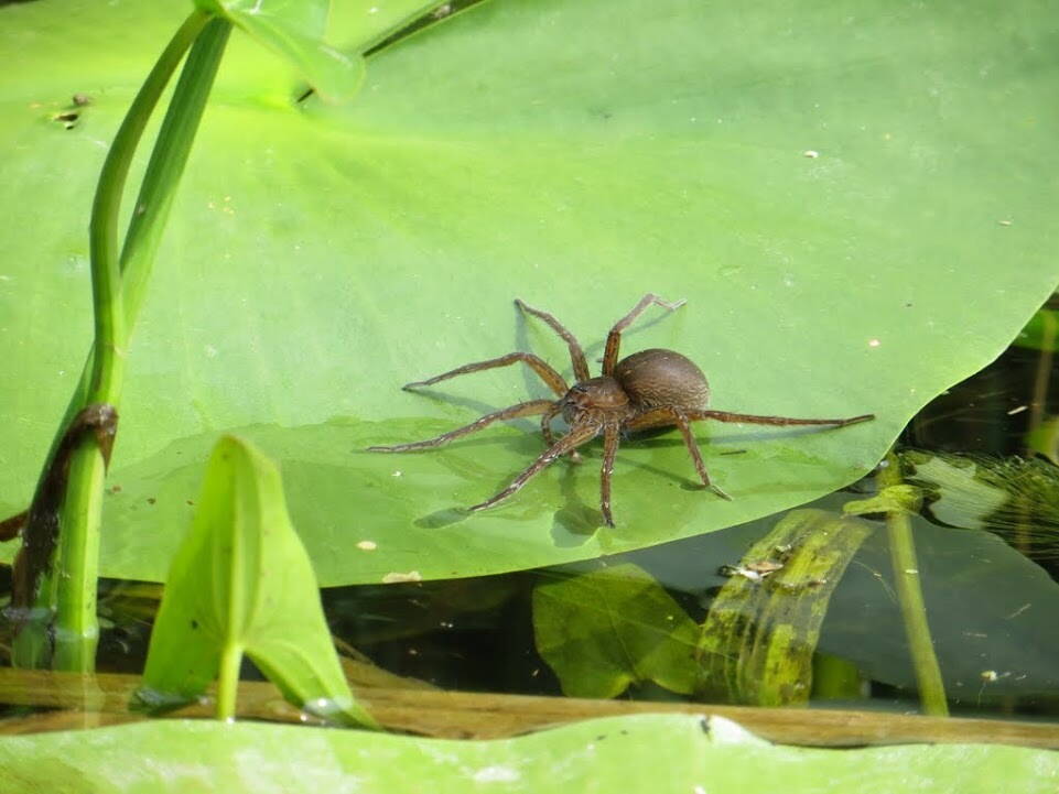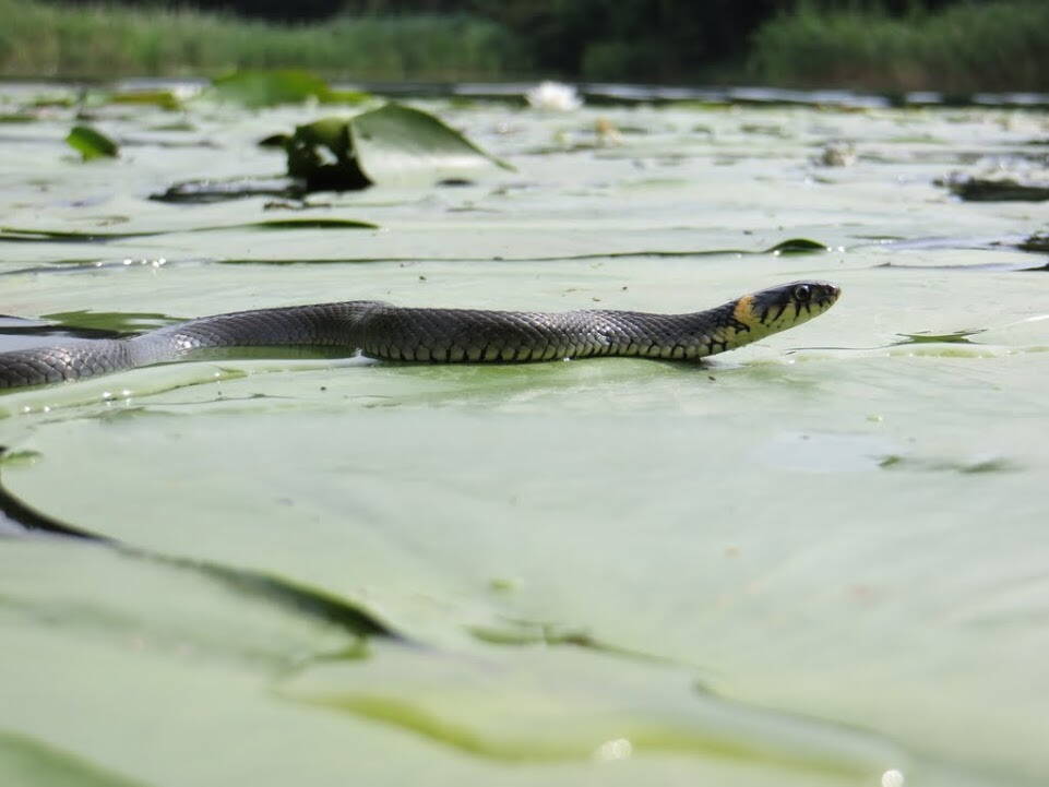 Наблюдали за охотой ужика на лягуху, крупными водяными пауками.
