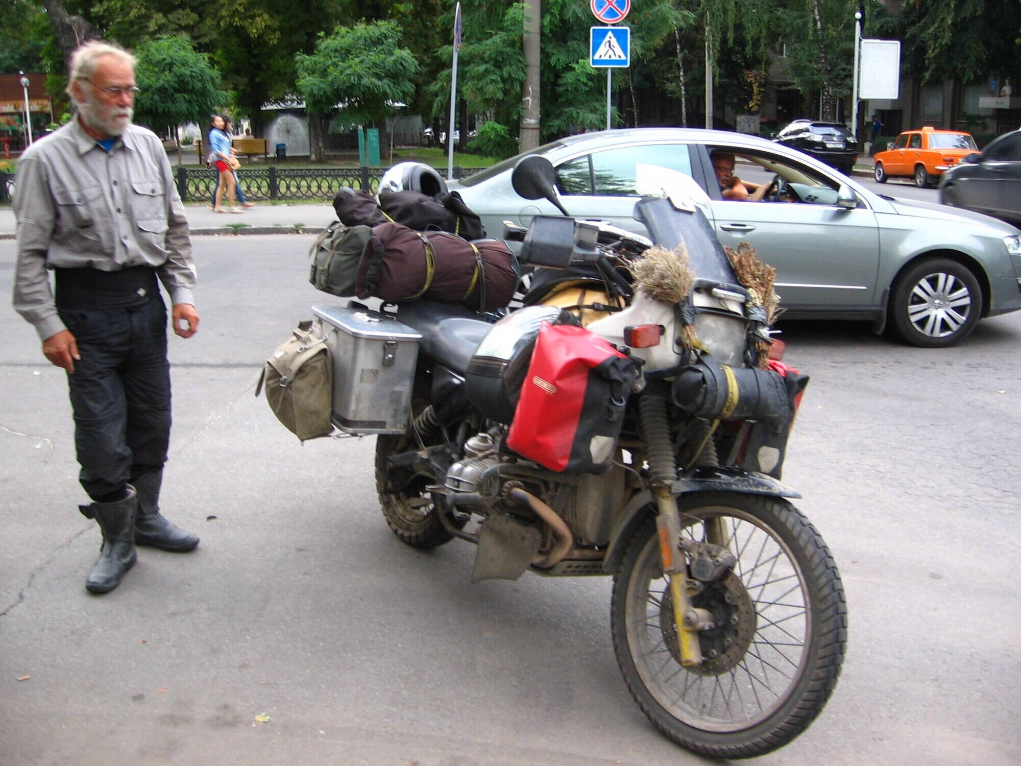 Иду в пятницу вечером по центру, за Держпромом. Стоит на обочине такой пыльный турэндуро БМВ с немецкими номерами, весь в сумках и кофрах. БМВ не из этих новомодных, а старый, еще с нижневальным мотором, цилиндры которого на ураловские похожи.