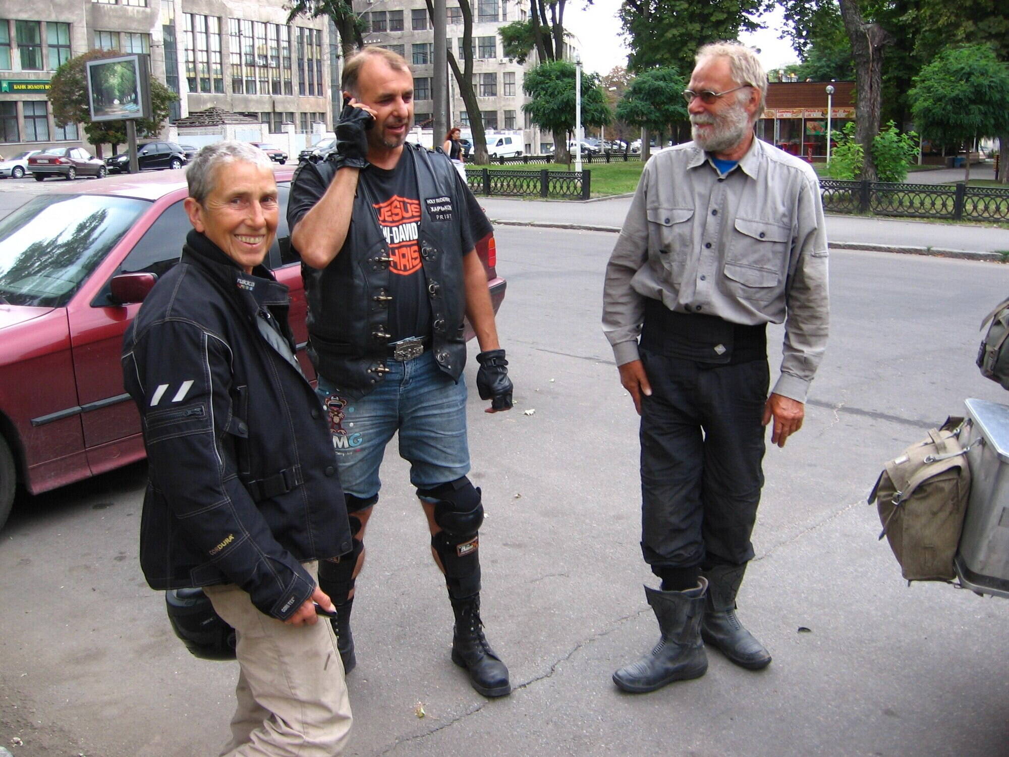 Тут подходит к нам местный байкер чопперной наружности. Все рады встрече, оказывается жена искала адрес этого местного. Байкер-Геннадий рассказал всю историю. Ему несколько недель назад позвонили друзья-байкеры из Новосибирка, сказали у немца-путешественника накрылся аморт, нужно из Германии заказать новый, а дед в Харькове заедет и аморт установит. Амортизатор уже давно у Геннадия дома, ждет немца.