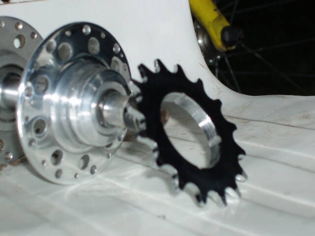 Колёса: Втулки "Старт-Шоссе" (старые, оч. б\у) с высоким фланцем, отполированы (живьём очень хорошо смотрятся, фотки же подчёркивают дефекты). Задняя ось выточена из нержавейки, передняя - родная. В ней нарезана резьба М6, ось закреплена в вилке соответствующими болтами. Выточены латунные шайбы для понта и "старинного" вида. Фиксозвезда накручена с изнасилованием (там та же фигня с размерами буржуйской\советской резьбы, что и в каретках). Для мёртвой фиксации резьбы в звезде алмазным круглым надфилем випилил четыре полукруглых паза под шпонки - пины от велоцепи. Эти же пазы при накручивании работали, как кромки плашки , но всё равно, попотеть пришлось. После накручивания звезды,