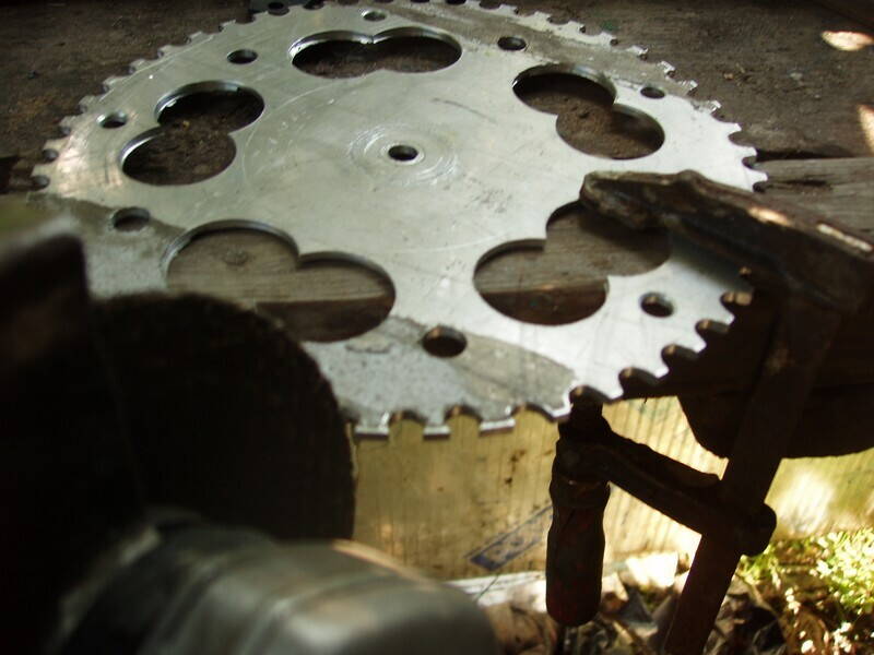 сломав несколько свёрл.. эээ..досверлил отверстия на теле втулки и забил туда пины от цепи. Если повторять конструкцию сейчас, я бы сделал одну шпонку, причём резьбовую. То, что звезда несъёмная (без болгарки), меня не парит. Т. к. нужного размера спиц не оказалось, пришлось покупать более длинные и откусывать головки, гнуть концы - всё видно на фотках.