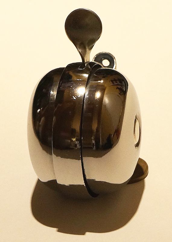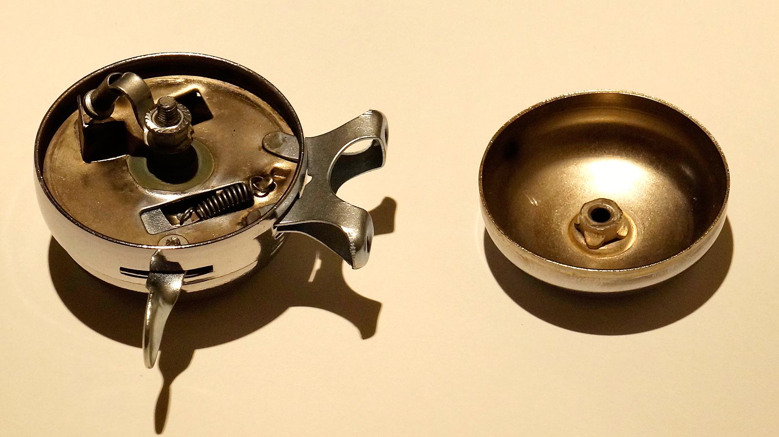 Отдельно надо упомянуть (и сфотографировать) звонок: таких не встречал, а как звонок работает на удивление эффективно. Он крепится за среднюю часть, а верхняя и нижняя вращаются. Фактически это два звонка. При нажатии на рычажок, чашки начинают вращение, выступами взводят две пружины с ударниками, которые, срываясь, ударяют по чашкам. Получается сдвоенный звук. Или несколько сдвоенных громких звуков, если инерции чашек хватит на несколько оборотов. Рекомендую.