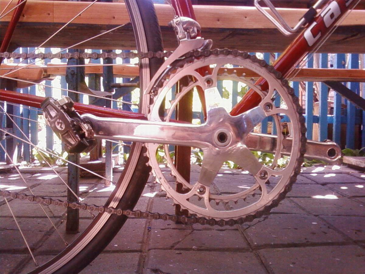 Сразу извените за качество фоток,пришлось фоткать на телефон. Стартон я собирал по крупицам: была рама с вилкой,потом нашел вынос Forged(японец-130мм) и руль спецзаказ,откуда-то взялся переклюк ХАРЬКОВ(тянет 7 звёзд),ещё было седло wildernes SSTX и пЭдали с туклипсами.Я поднял свою задницу и пошел на рынок,купил неизвестную дюралевую систему 52*39 (50гр),передний переклюк Shimano C 050(35гр),манетки Shimano SL-R400(80гр),ручки Shimano BL-R400(115гр),обода Weinmann DPX(300гр пара).Пришёл домой, на радостях посрезал с рамы все бонки и пошёл на работу,сказал мастеру что мне на всех нас...ь,взял дюралевую болванку,свой набросок и пошёл точить втулки.Когда втулки были готовы,я их взвесил(по 280г каждая без оси и подшипников :shock: ),пришлось нарушать аэродинамику и фрезеровать на фланцах пазы(для уменьшения веса).Потом выточил 2 оси и пыльники,купил 201 подшипники(5гр штука) собрал всё докучи,отполировал,взвесил(передняя295г,задняя330г).Купил у товарища каретку Campagnolo но не подошла резьба,пришлось точить чашки через знакомого(он работает с титаном),вал оставил родной.Набрал колёса,припаял упоры под манетки и бонки.Собрал вел,взвесил-12кг200г.Опробовал на трассе очень даже не плохо,а накат просто супер. Спецзаказ мне достался за 200$ с прямым рулём ,задним переклюком Shimano Alivio(8-рик) и передним Shimano RX-100,клинчерами RJ Project(франция) и самопальными втулками на пром.подшипниках под кассету(размеры брали: для передней-Mavic,для задней-Campagnolo). Мой колега менял оборудование на своём Colnago Master и мне повезло купить у него руль и вынос Cinelli,ручки и манетки Shimano105. Из истории этой рамы: раму покупал мой колега в 80-х годах прошлого столетия в Симферополе у гонца. На раме тогда ещё не было ни бонок,ни упоров под манетки. Рубашка крепилась при помощи хомутиков, а манетки на рамке с креплением под насос.
