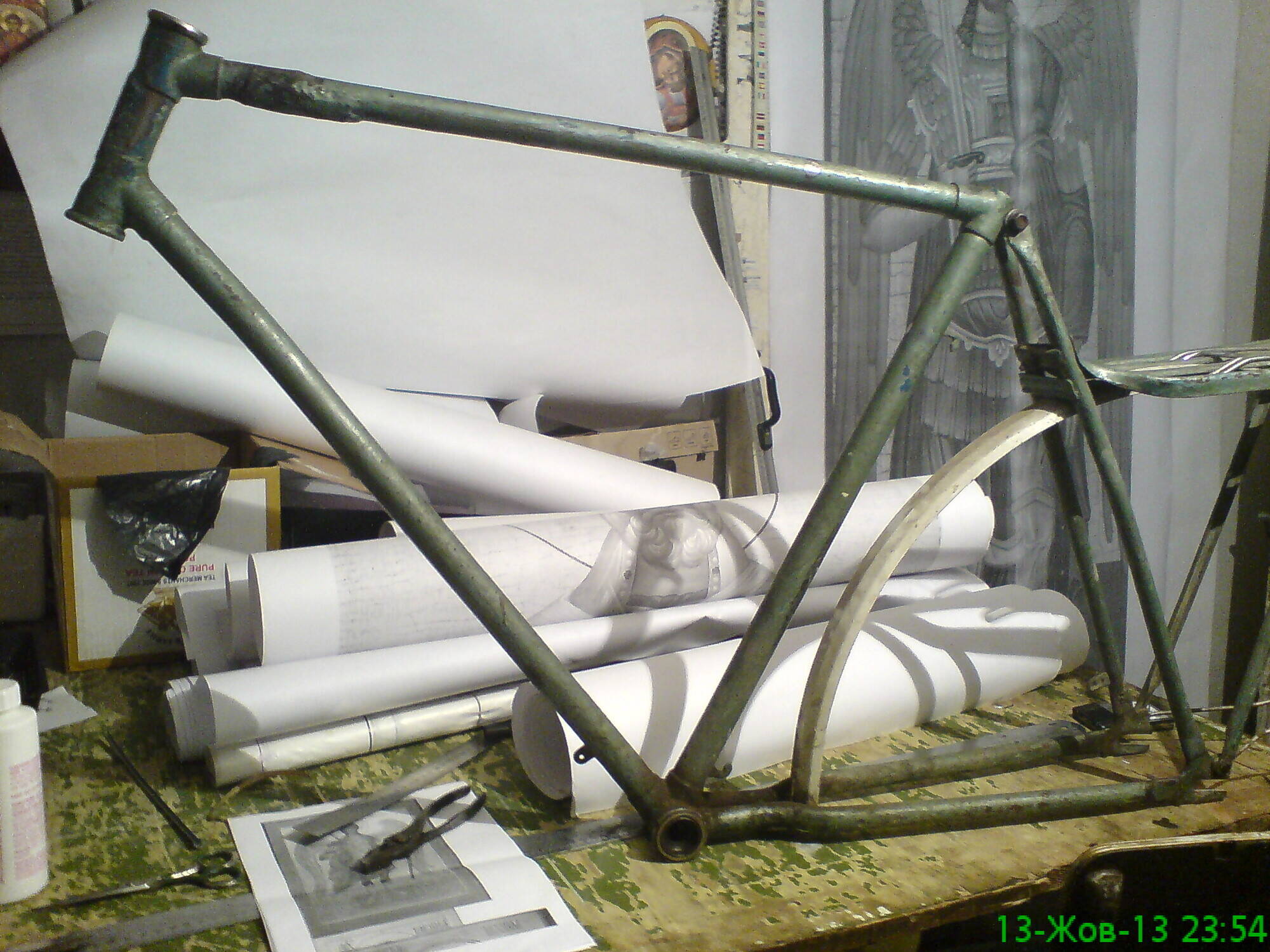 До (точнее, во время - каретка припаяна уже и задние трубки отрихтованы) В том месте, где на раме Николая сварка, на моей вообще кусок выгнил и на изоленту была нахлобучена как-то дюймовая водопроводная труба :) Видно, что я собираюсь заменить её куском трубы от другой рамы: